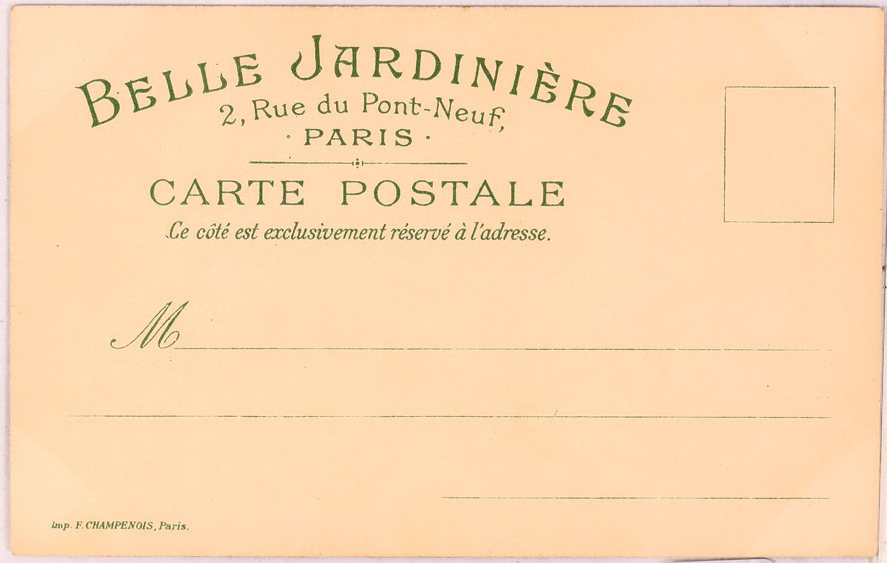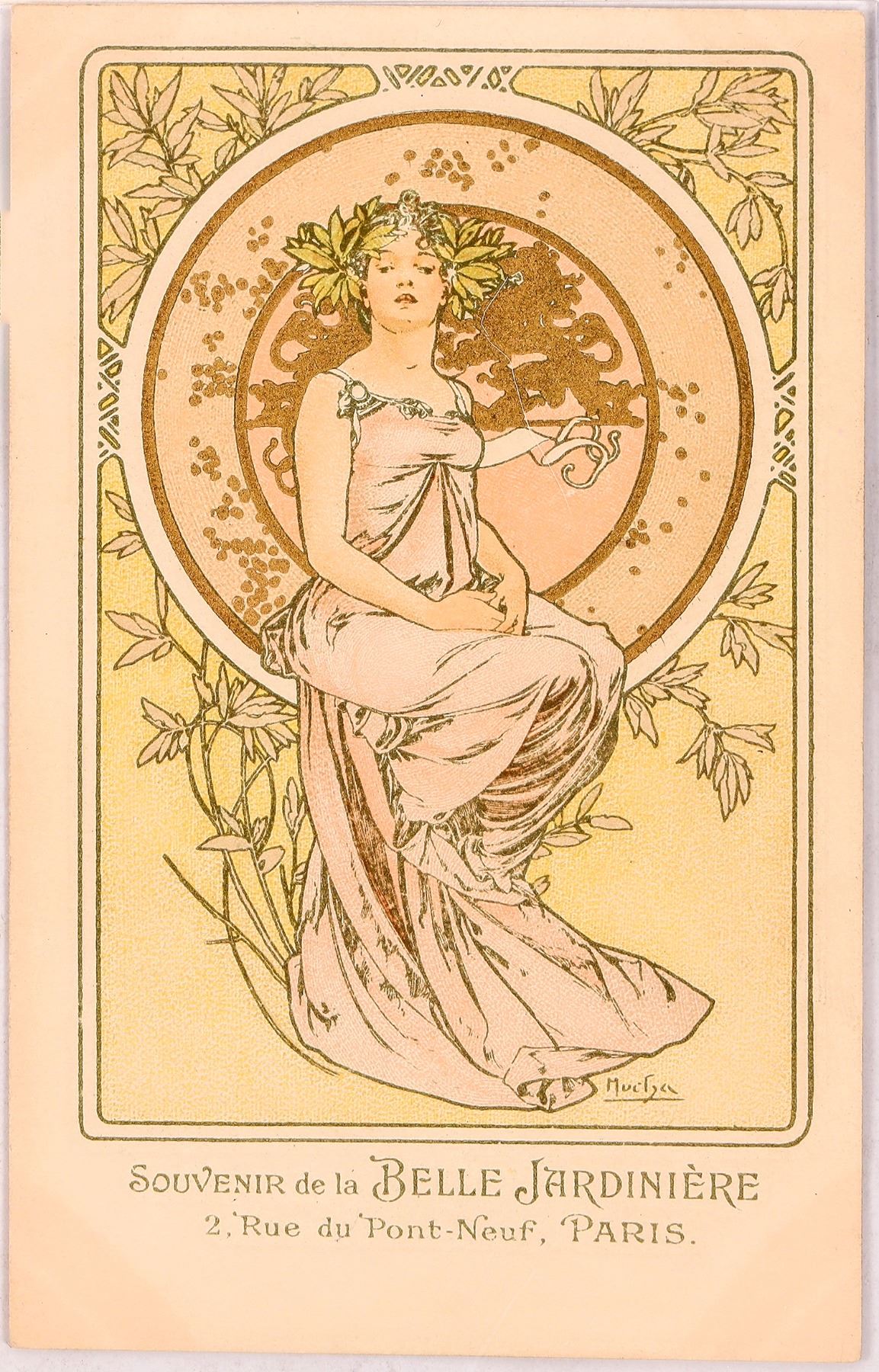 This is a postcard designed by Alphonse Mucha, c1900-05. No. 486. Banquet Menu. R-5. Vertical design occupies nearly all of the card. Lady in pink dress with hands in her lap sits in a large vertical circle frame. Belle Jardiniere advertising on back as used on cards with the front printed with an advertisement of the Paris department store - "Souvenir de la Belle Jardiniere; 2, Rue DuPont-Neuf, Paris." Unused. Light staining on corners due to being in an album, otherwise clean.