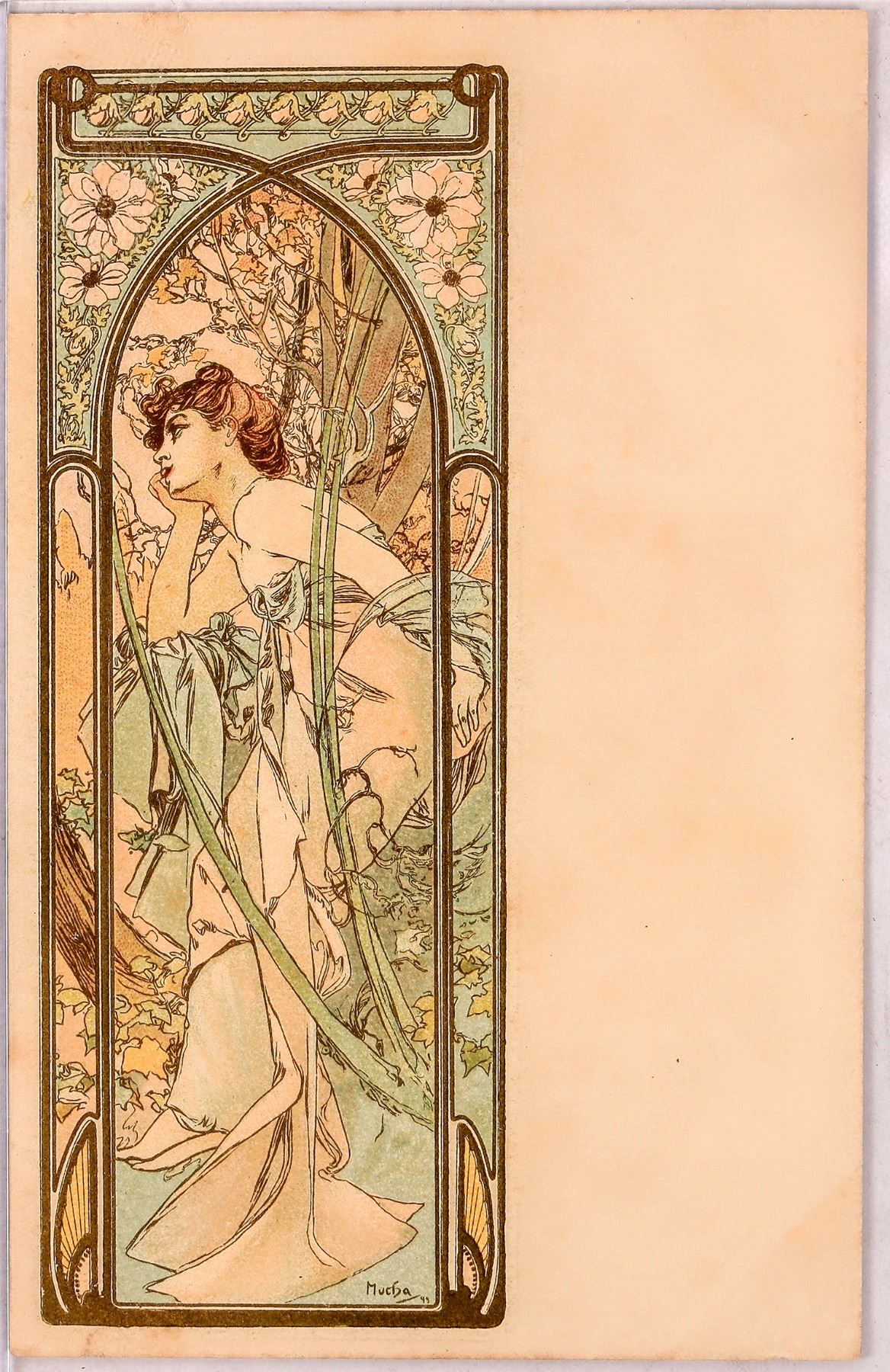 This postcard, c1900-05, was designed by Alphonse Mucha. No. 504. Reverie of Evening (Reverie du Soir). R-4. Lady in pink and green gown rests chin on hand. Unused. Light foxing, otherwise clean.