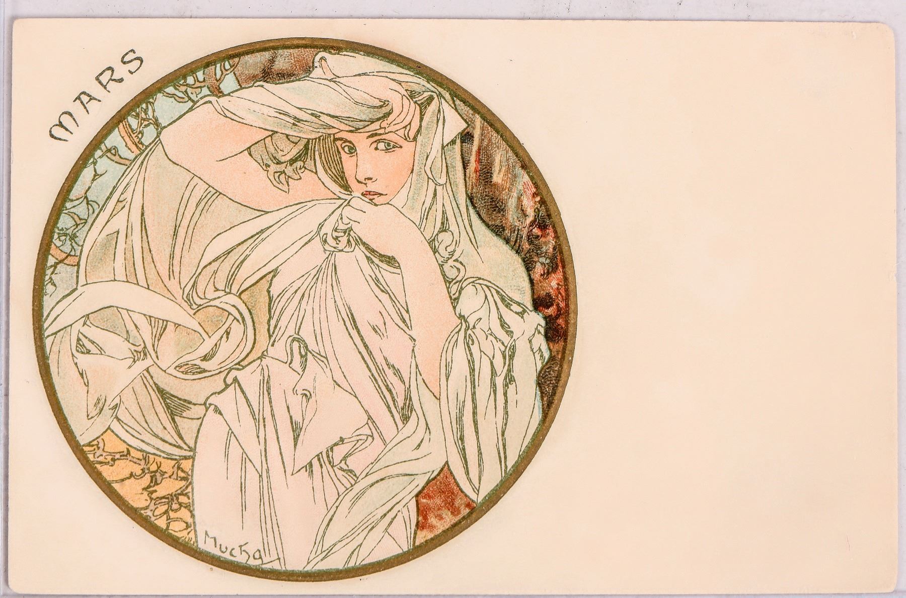 This postcard is part of Alphonse Mucha's 4th series, Le Mois, the months of the year. It is the most famous of the Champenois sets. No. 463, Mars (March). R-3. Lady in white dress with veil over head. (From "The Postcards of Alphonse Mucha," Q. David Bowers & Mary L. Martin, 1981.) Published by F. Champenois. Unused. Clean.