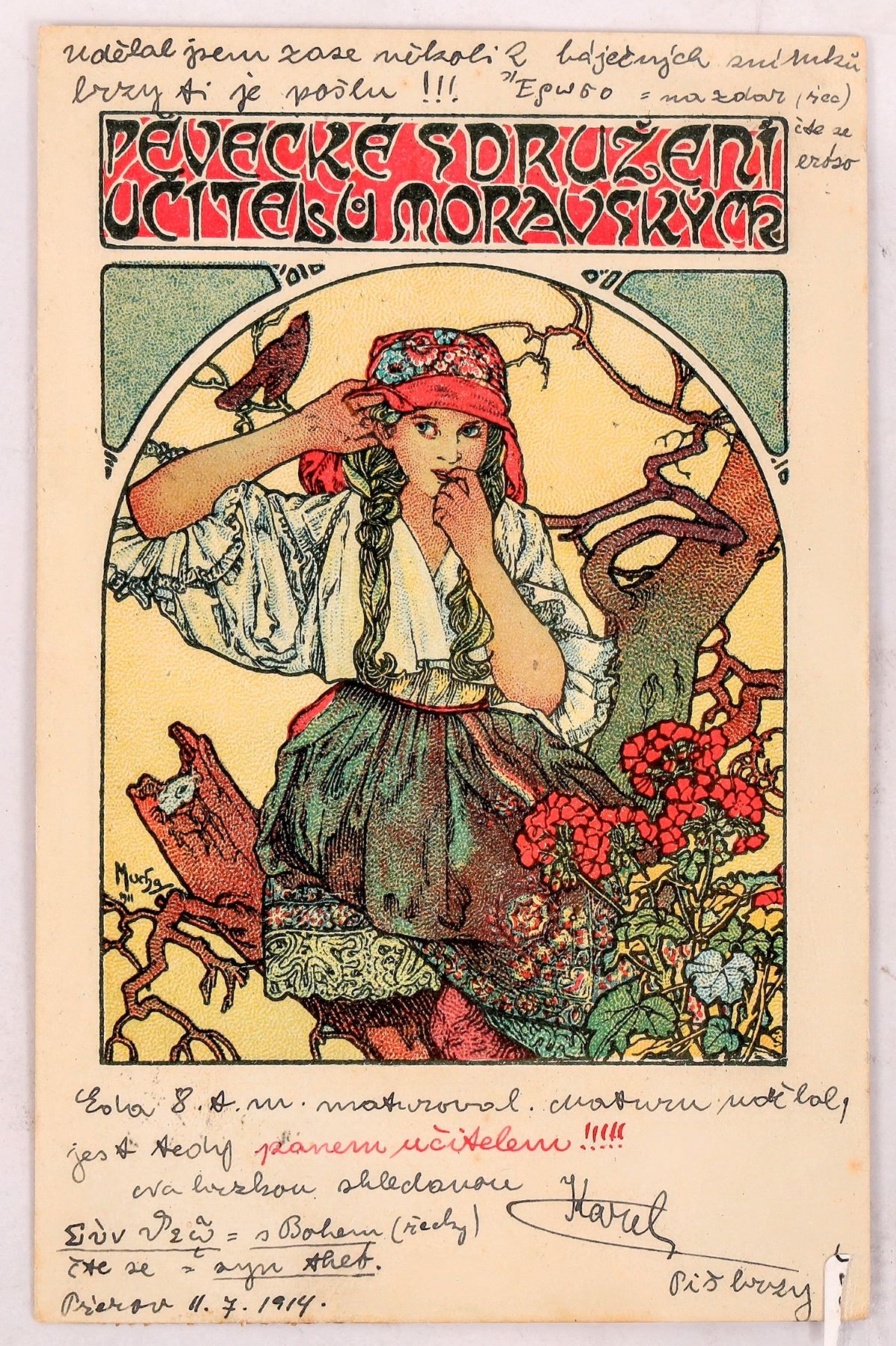 A postcard featuring one of the designs of Alphonse Mucha, circa 1914, Czech-