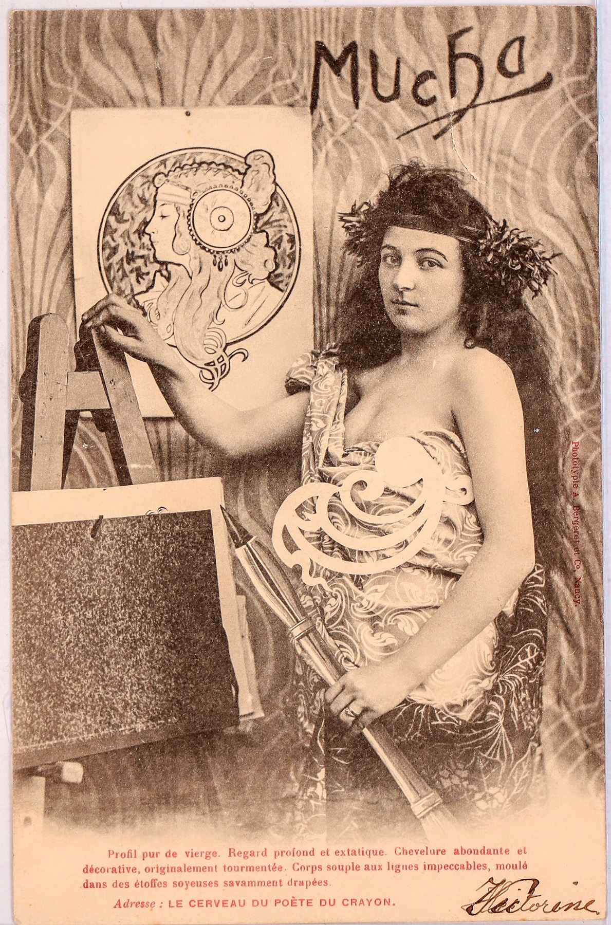 This French RPC advertising postcard shows Alphonse Mucha's decorative panel of the Blonde Byzantine Head (Card No. 422) on the wall, with a young girl and easel in the foreground. Translated caption reads: "Profile of a pure maiden. Her expression is deep and rapturous The hair is abundant and styled in natural cascades. The body is supple with impeccable lines, molded cleverly in a silken fabric." Below the caption: "Adresse: Le Cerveau du Pete du Crayon." Has Mucha's signature on front, a stamp and is postmarked 1903. Penned writing on front lower right and on verso, otherwise clean. (Info: "The Postcards of Alphonse Mucha," Q. David Bowers & Mary L. Martin, 1981.)