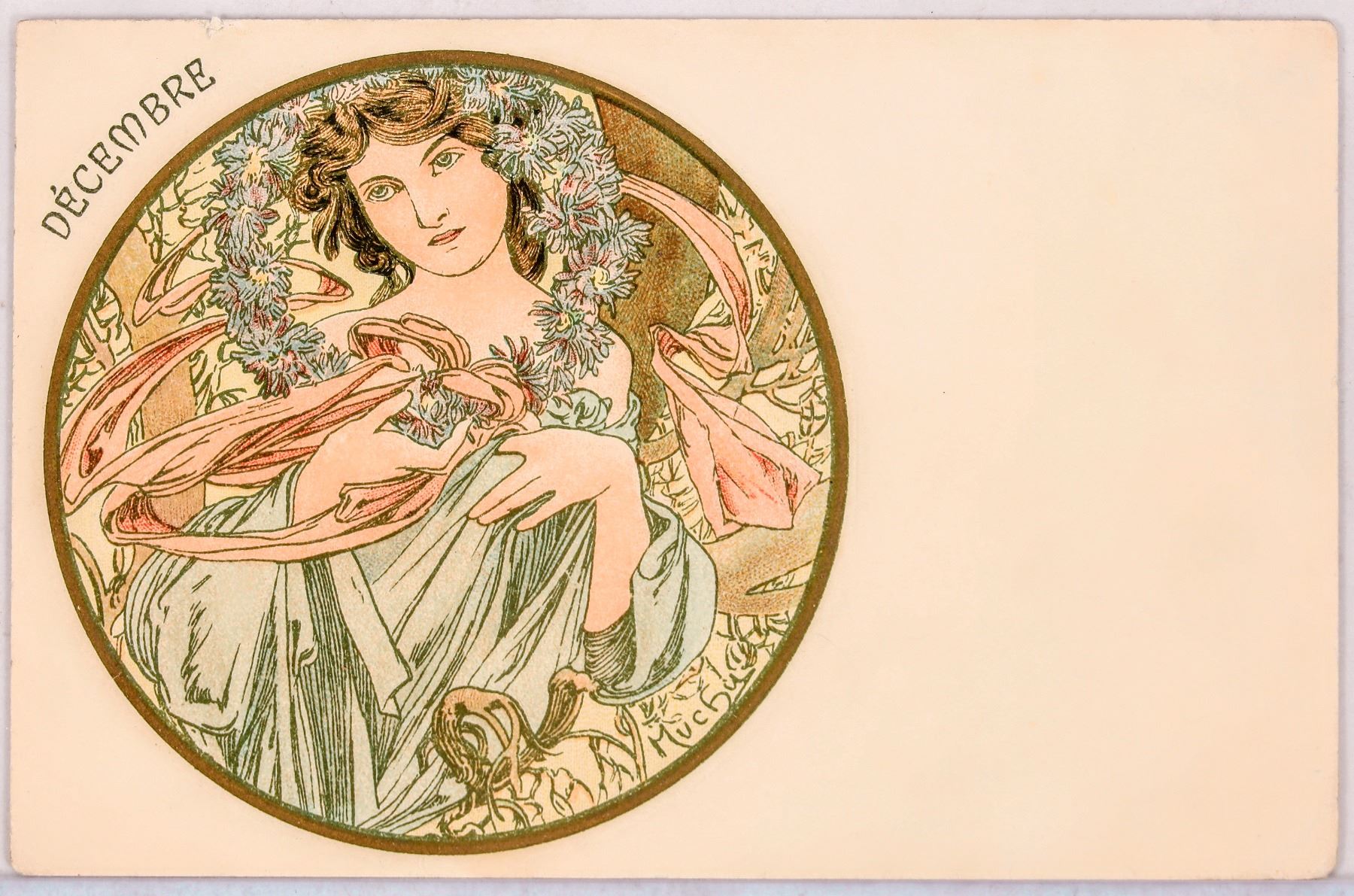 This postcard is part of Alphonse Mucha's 4th series, Le Mois, the months of the year. It is the most famous of the Champenois sets. No. 472, Decembre (December). R-3. Lady in green dress with red scarf; floral wreath around face. (From "The Postcards of Alphonse Mucha," Q. David Bowers & Mary L. Martin, 1981.) Published by F. Champenois. Unused. Small chip upper left, otherwise clean.