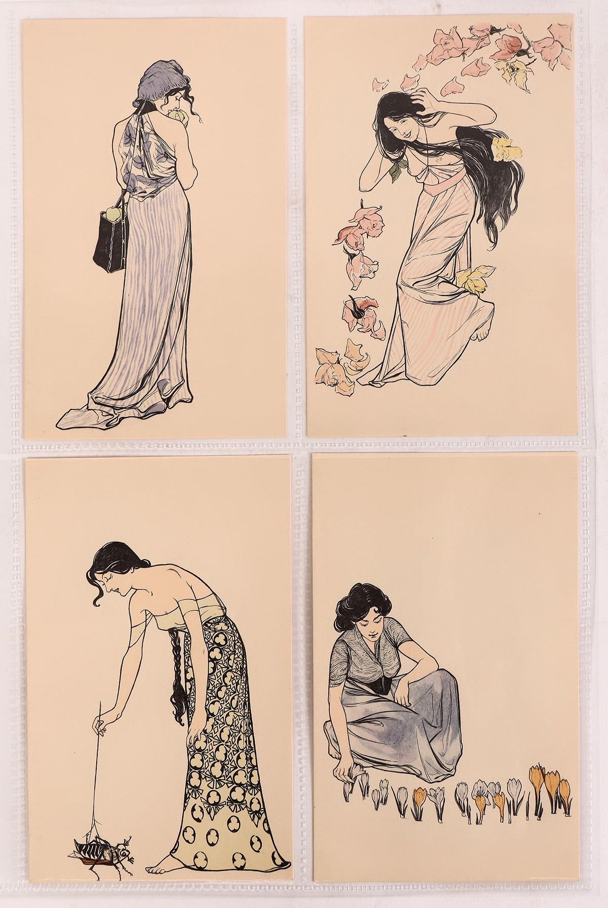 A set of 4 Art Nouveau postcards by unknown artist, from about 1900s-20s. Delicate and unique designs. Universal Postal Union (United Nations) seal printed on backs, "Carte Postale ... Weltpost-Verein. Unused. Clean. For more information on the Art Nouveau movement, see Lot #185447. [] [] [Europe] [] []