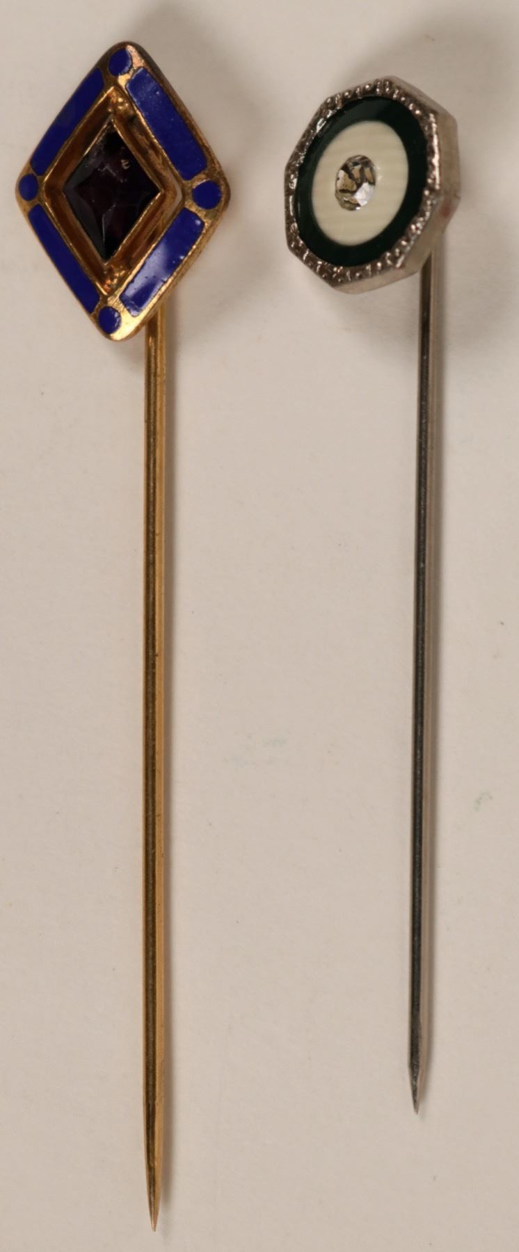 Two Choice Stick Pins with jewels and enamel designs. Highly collectible pieces.