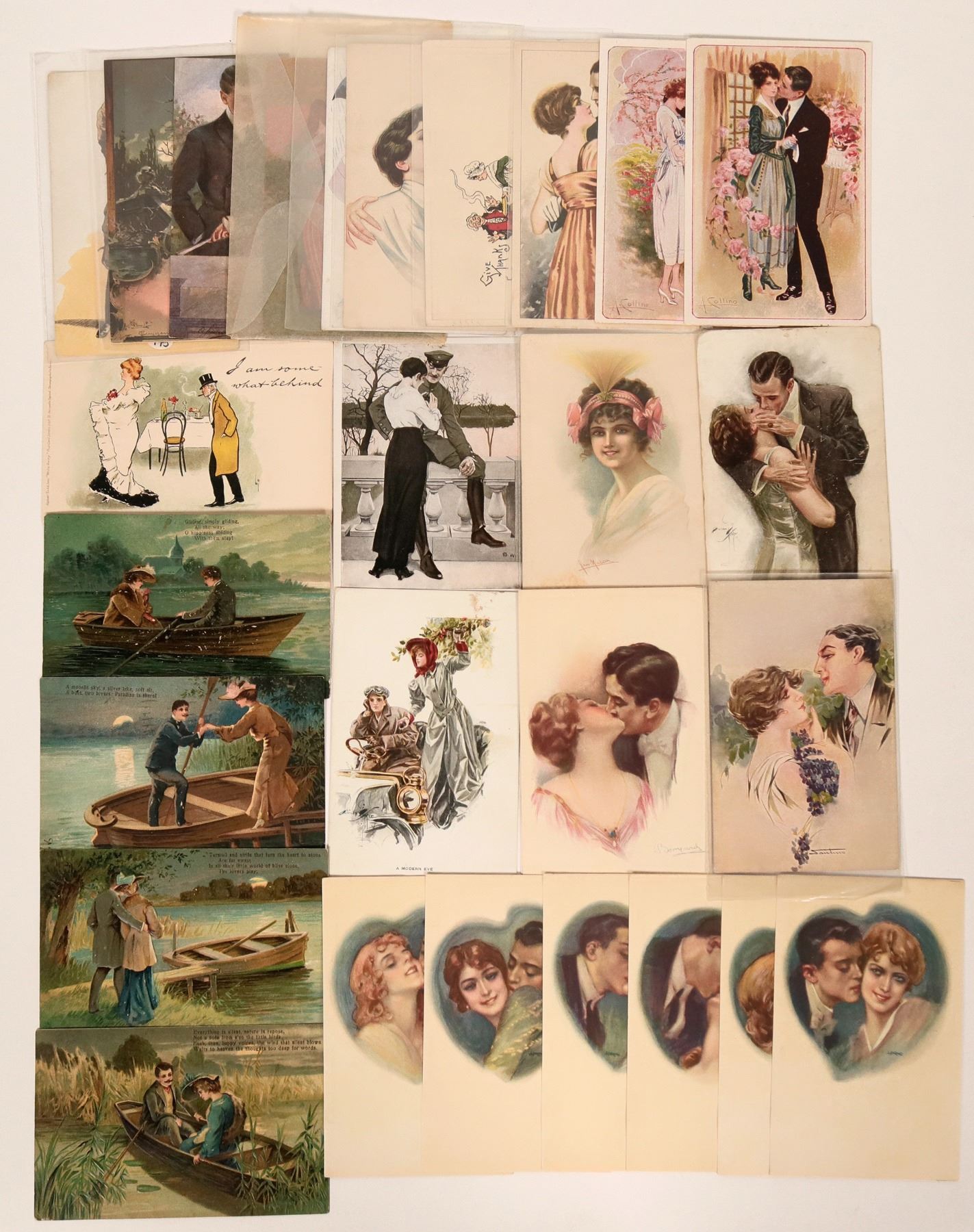 Includes one Tuck card. and another card signed by B. Wennerberg. Large lot includes several cute groups of traditional romantic imagery. Includes a group of 4 vibrant landscape postcards in relief. View photos.