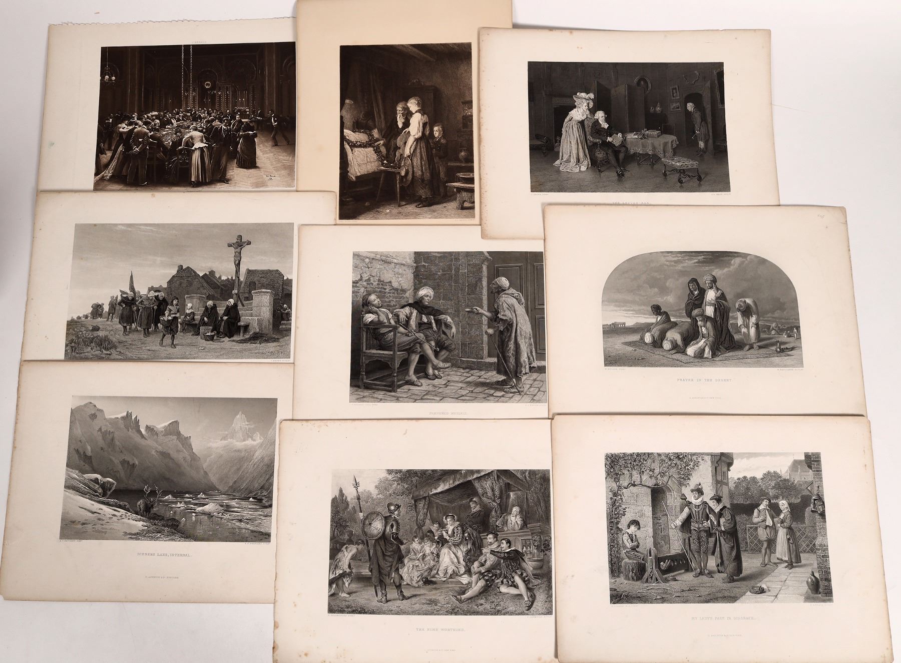 About 67 19th century art prints in folio format, generally 11.5x15" and mostly steel engravings. A significant group of 27 prints apparently from D. Appleton's(New York) "New Gallery of British Art, Containing 121 engravings on steel from the works of distinguished British painters" c. 1880. Includes a fine print of gambling in Monte Carlo.