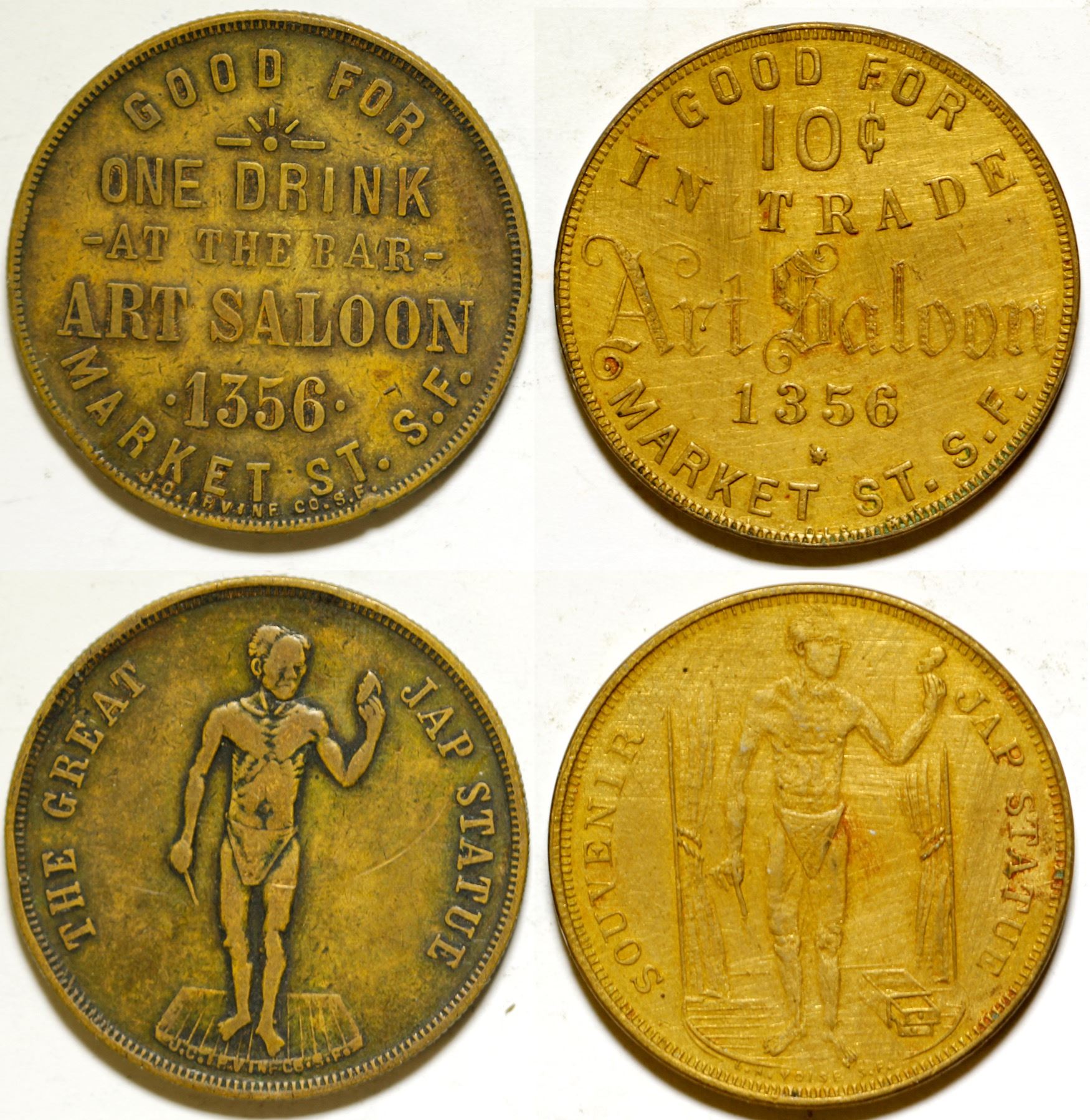 Two versions of the famous Art Saloon token: Kappen 90 & 93. "The Great Jap Statue." Daniel Manassillian Collection. State: California City: San Francisco Date: HWAC# 84343