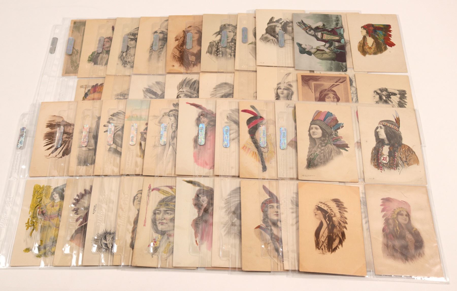 70+ black and white and color postcards and 3 duplicates. Artwork, sketches, portraits, some from early 1900's. Pictures include those of chiefs, squaws, Indians shooting arrows and babies in a papoose.