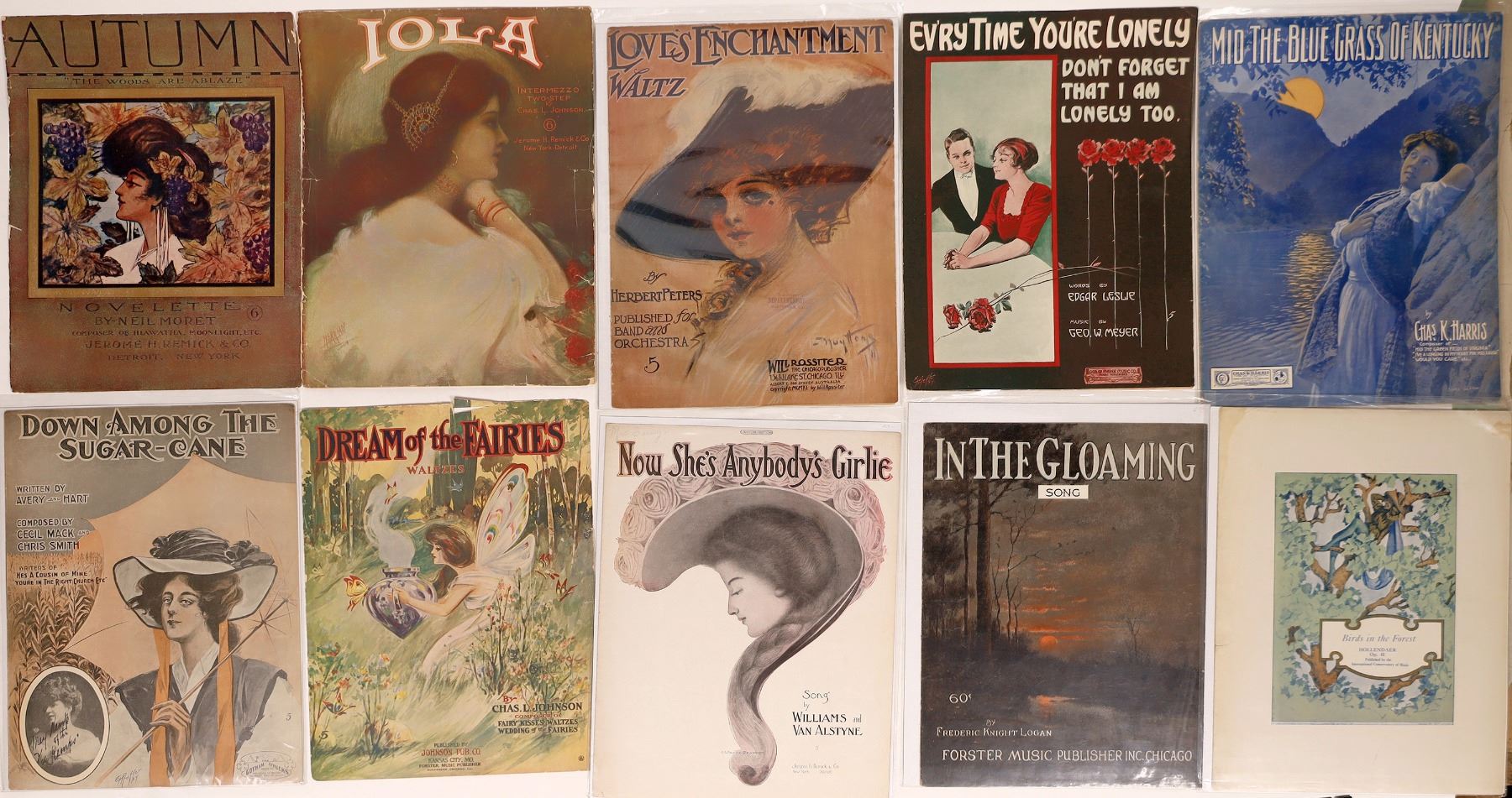 Lot of ten pieces by nine different artists: 1) Wm. Young, "Birds in the Forest" (E); 2) Van Allen, "Mid The Blue Grass Of Kentucky (E); 3) Tunison, "In The Gloaming" Chicago, (E); 4) Ward Traver, "Now She's Anybody's Girlie, (E); 5) Schilbere, "Dream of the Fairies," (VG, cover only); 6 & 7) Pfeiffer, "Down Among The Sugar-Cane," (E); "Ev'ry Time You're Lonely Don't Forget That I Am Lonely Too," (E); 8) Nuyttens, "Love's Enchantment Waltz," Chicago, (E); 9) Merrian, "Iola," (VG);10) Edward Light, "Autumn, (VG, cover only).