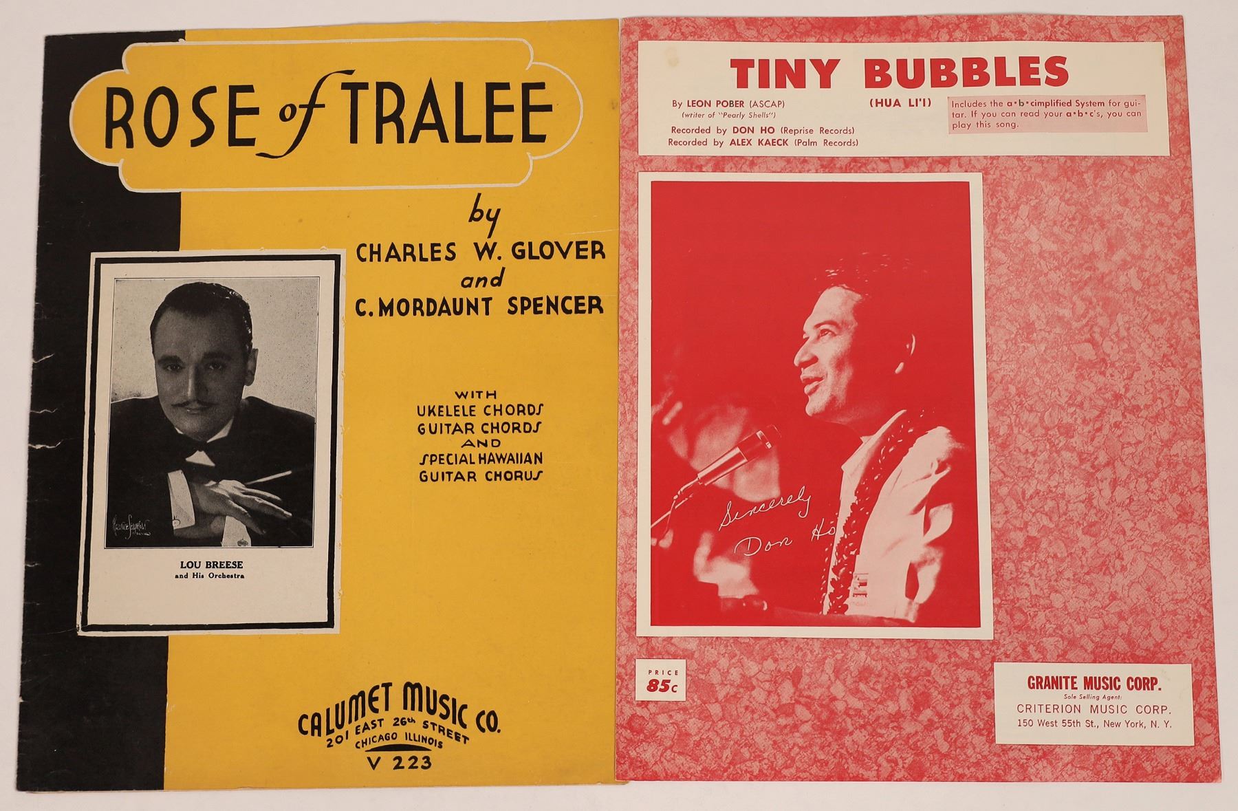 Lot of two Hawaiian themed sheet music, both 9 x 12 inches: "Tiny Bubbles," with Don Ho on the cover; and "Rose of Tralee" with bandleader Lou Breese in photograph. Ken Prag Collection Hawaii Ken Prag Collection