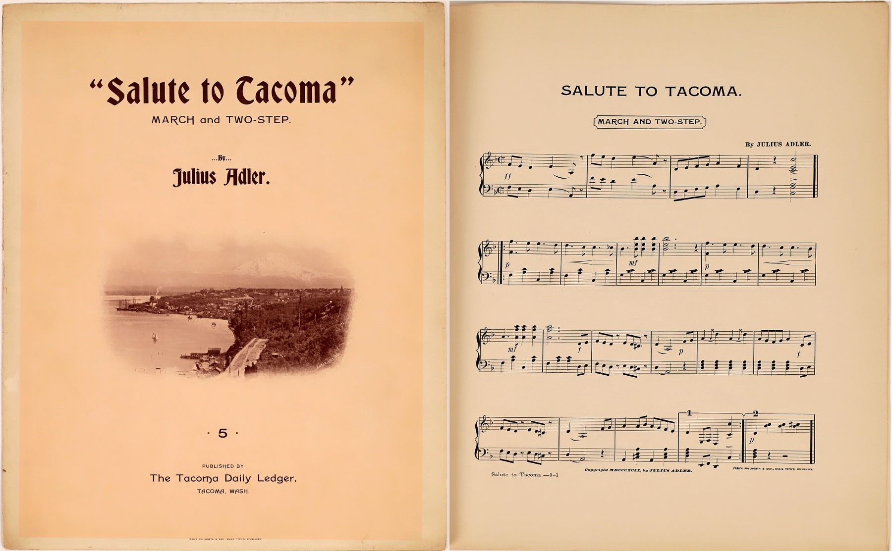 Published by The Tacoma Daily Ledger with a photograph of the city and Mount Rainier: "Salute To Tacoma."