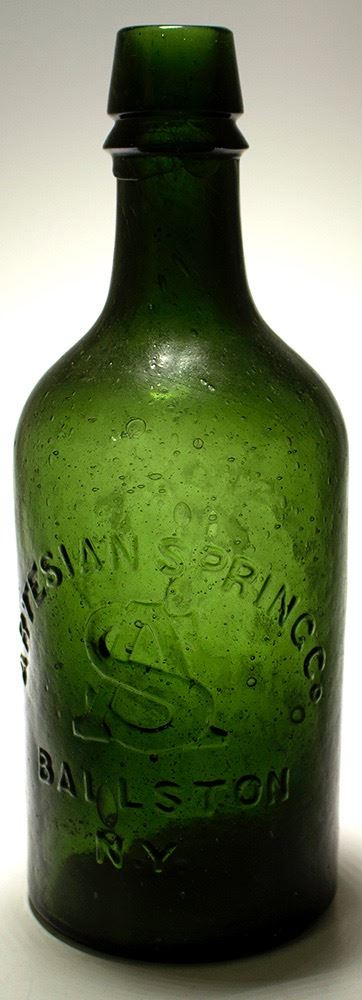 Saratoga mineral water bottle from the Shamberger collection. No visible chips or cracks except as noted. ARTESIAN SPRING CO./ AS/ BALLSTON/ N.Y// BALLSTON SPA./ AS/ MINERAL WATER. These waters are rich in lithe and other components. 2 small lip imperfections. S-5. HWAC# 50157 Date: Location: Balston, New York
