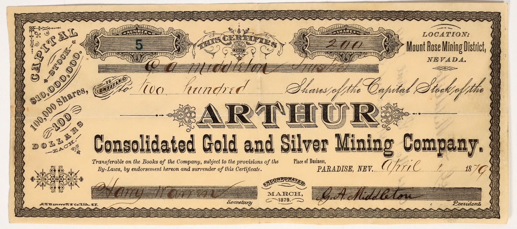 Rare. Location: Mount Rose Mining District, Nevada (printed at upper right). Low number 5, issued for 200 shares to president Middleton in 1879. Incredibly RARE dateline Paradise, Nev. Signed by secretary Harry Warren and president Middleton. Folds. The Mount Rose district was located on the edge of Paradise Valley north of Winnemucca. Paradise was a short-lived mining camp but settled in to support the many ranches in the area. Secretary Harry Warren would be the last editor/owner of the Paradise Reporter.