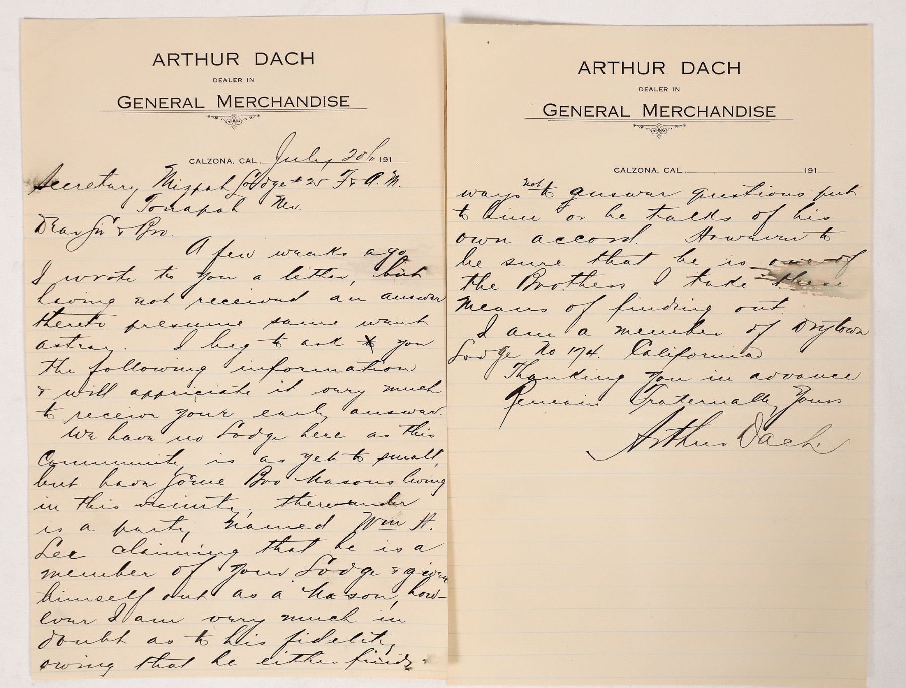 2x 1910's Arthur Dach letterheads from Calzona, CA. "Calzona is an unincorporated community located in San Bernardino County in the U.S. state of California. The town is located approximately 10 miles southeast of Vidal Junction, California, five miles east of Vidal, California, and borders the southern edge of Big River, CA. It is less than a mile from the Colorado River. It is located in the Sonoran Desert and in a transition zone that includes climatic and botanical aspects of Mojave Desert." from Wikipedia