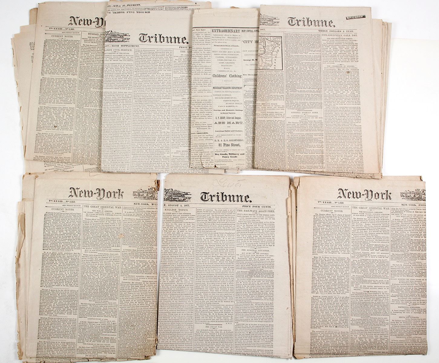 Seven Newspapers discussing all elements of the Little Big Horn Massacre, from Custer's funeral, burial. Of great significance is a NY Trib article July 10, 1877 that describes how Custer dies, in what may be the first article so doing. The article is entitled "In Sitting Bull's Camp; A Spy's Interesting Story; How Custer Died." The paper has the usual wear and tear at teh fold corners, which does not affect the key article in the slightest. Date: Location: Montana HWAC# 62159
