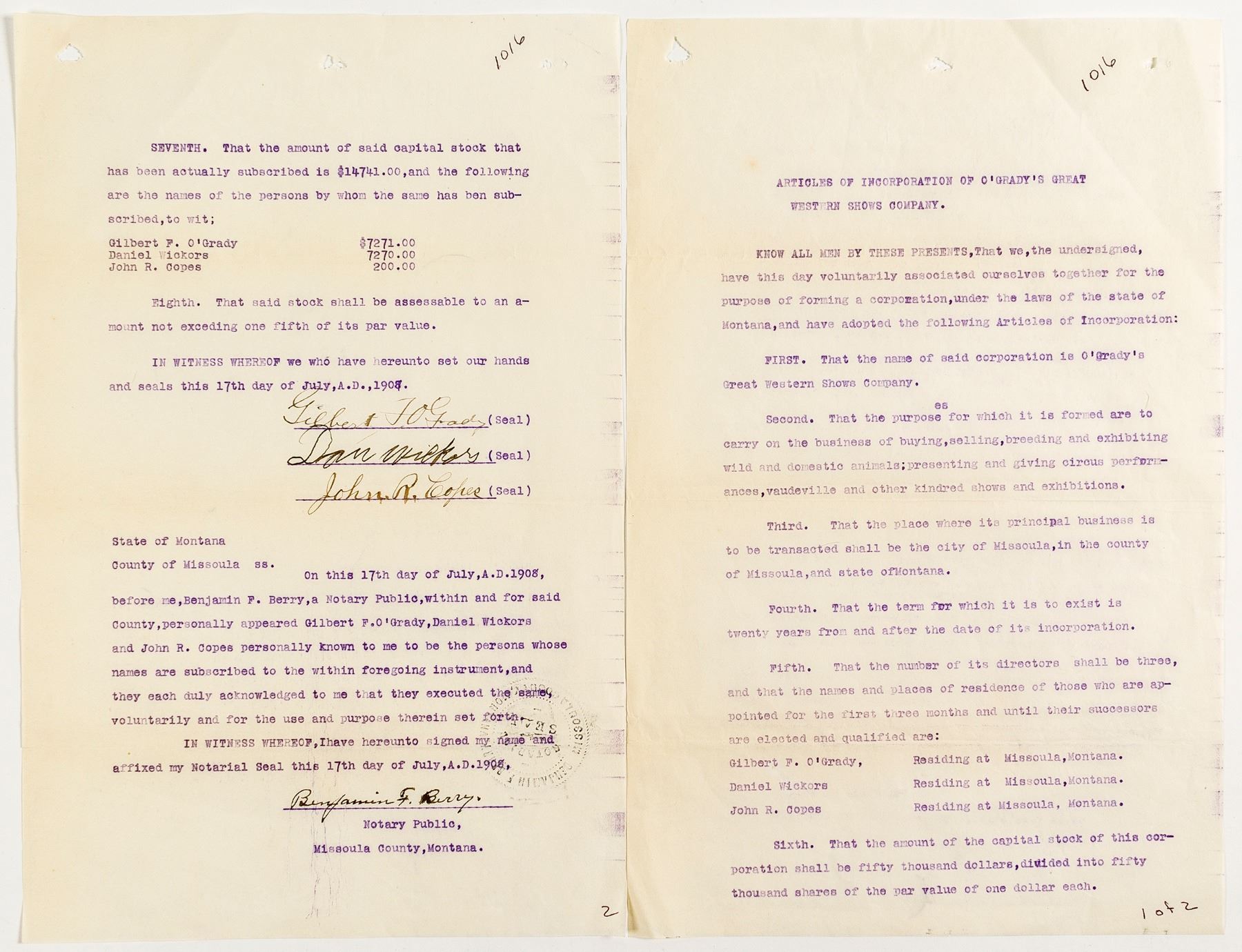 Articles of Incorporation of O'Grady's Great Western Shows Company. "The purpose as for which it is formed are to carry on the business of buying, selling, breeding and exhibiting wild and domestic animals; presenting and giving circus performances, vaudeville and other kindred shows and exhibitions." Three directors: Gilbert F. O'Grady, Daniel Wickers and John R. Copes. Capital stock in the amount of $14,741.00.