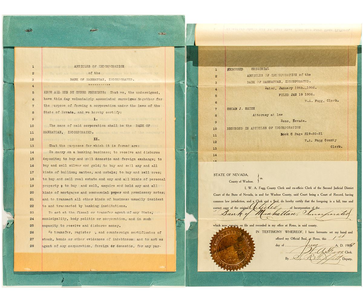 This bank lasted only 6 months! Official 1909 copy of the articles of incorporation for the bank that were originally filed on Jan. 19, 1906. Five pages. Principal place of business to be at 202 Virginia Street in Reno with Oscar J. Smith as agent. Lists original backers and their share in the company. Delicate paper with toning and some tears.