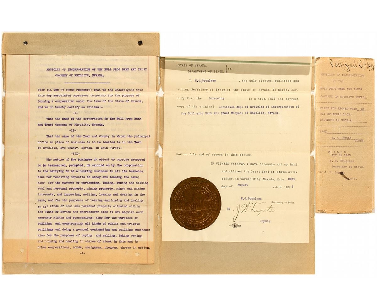 Certified Copy! Includes the Nevada state seal. The Bullfrog Bank and Trust Co. was incorporated in 1905, in the boom and bust mining town of Rhyolite, Nevada, located in the heart of the Bullfrog Mining District. Although there were other towns established nearby, including Beatty and Goldfield, Rhyolite became the main area for financial growth. Rhyolite's population peaked at 10,000 in 1907, with electricity and railroads connecting the town to Los Angeles, San Francisco, and Las Vegas, enabling the banking systems to connect across state lines. The Bullfrog Bank and Trust Co. took this opportunity to serve the financial needs of the growing number of residents, becoming one of the two main banks in Rhyolite, the other being the John S. Cook and Co. Bank. The Bullfrog Bank did have a second branch in Beatty, Nevada; however, the Rhyolite location grew more quickly and had a larger financial holding.
