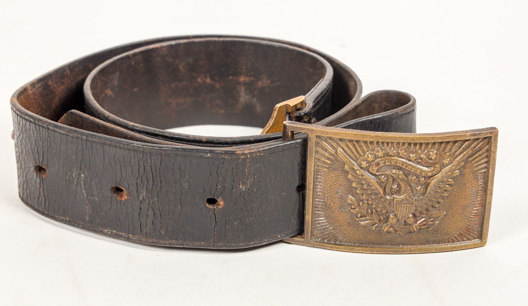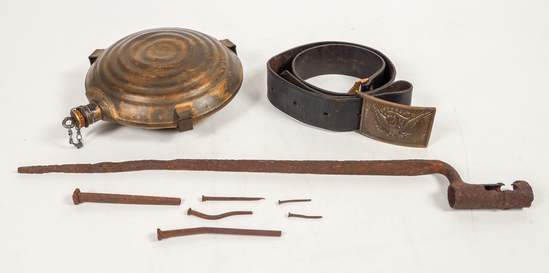 Lot of 5. 1. Bayonet, 21". Complete, but crusted. 2. Two packets from The Northeastern Nevada Museum Elko of square nails from: Fort Ruby and Fort Halleck. 3.Leather belt with brass buckle and clasp. Buckle has American eagle spread with with shield on chest. 35" including clasp and buckle. Belt is 40" in length total. VG cond. 4. Brass canteen. 8" round complete with cork on chain. No damage or dents. Overall excellent cond.