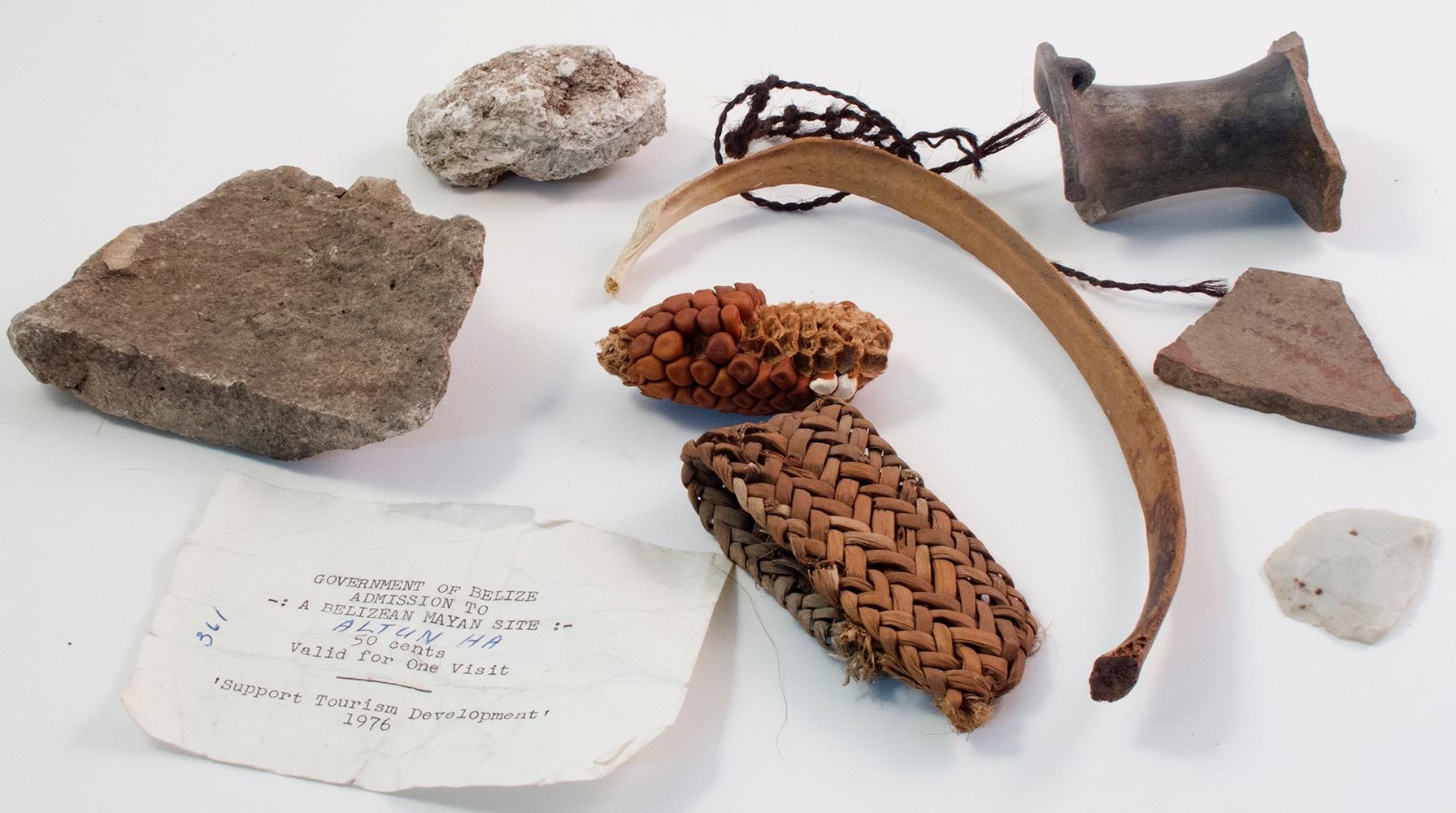 Artifacts--pieces of pottery, baskets, rock, and piece of corn packed in straw, from Wilber May to Clayton Phillips. Paper inside reads: Government of Belize. Admission to a Belizean Mayan Site- Altun Ha. 50 cents Valid for One Visit. "Support Tourism Development" 1976. On the back is a note that reads: these rocks came from site. Jum Herz gave them to me after we had been there. Date: Location: zBelize HWAC# 41671