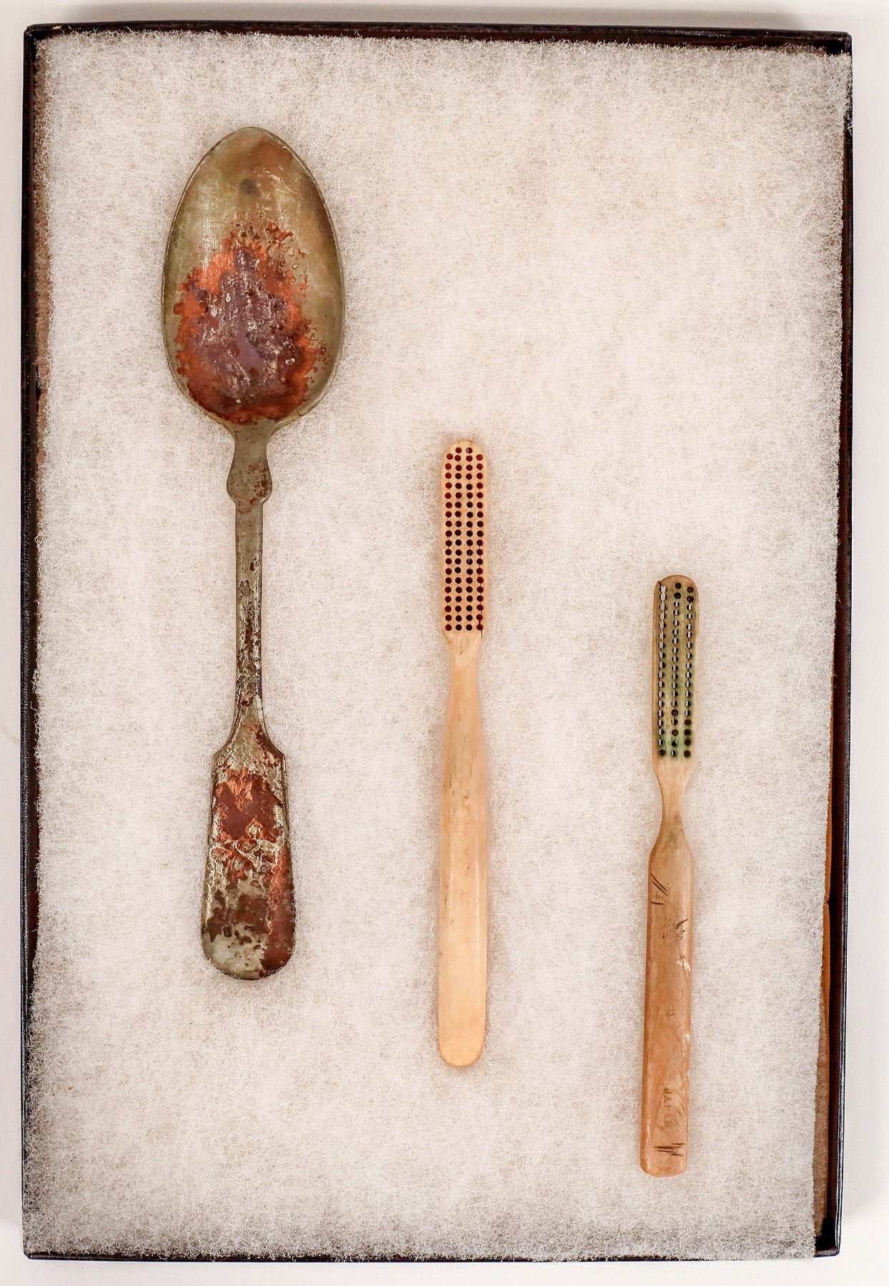 This Riker box contains a large serving spoon and two tooth brushed from Fort Custer. c.1877-1898. From the Sherman collection.