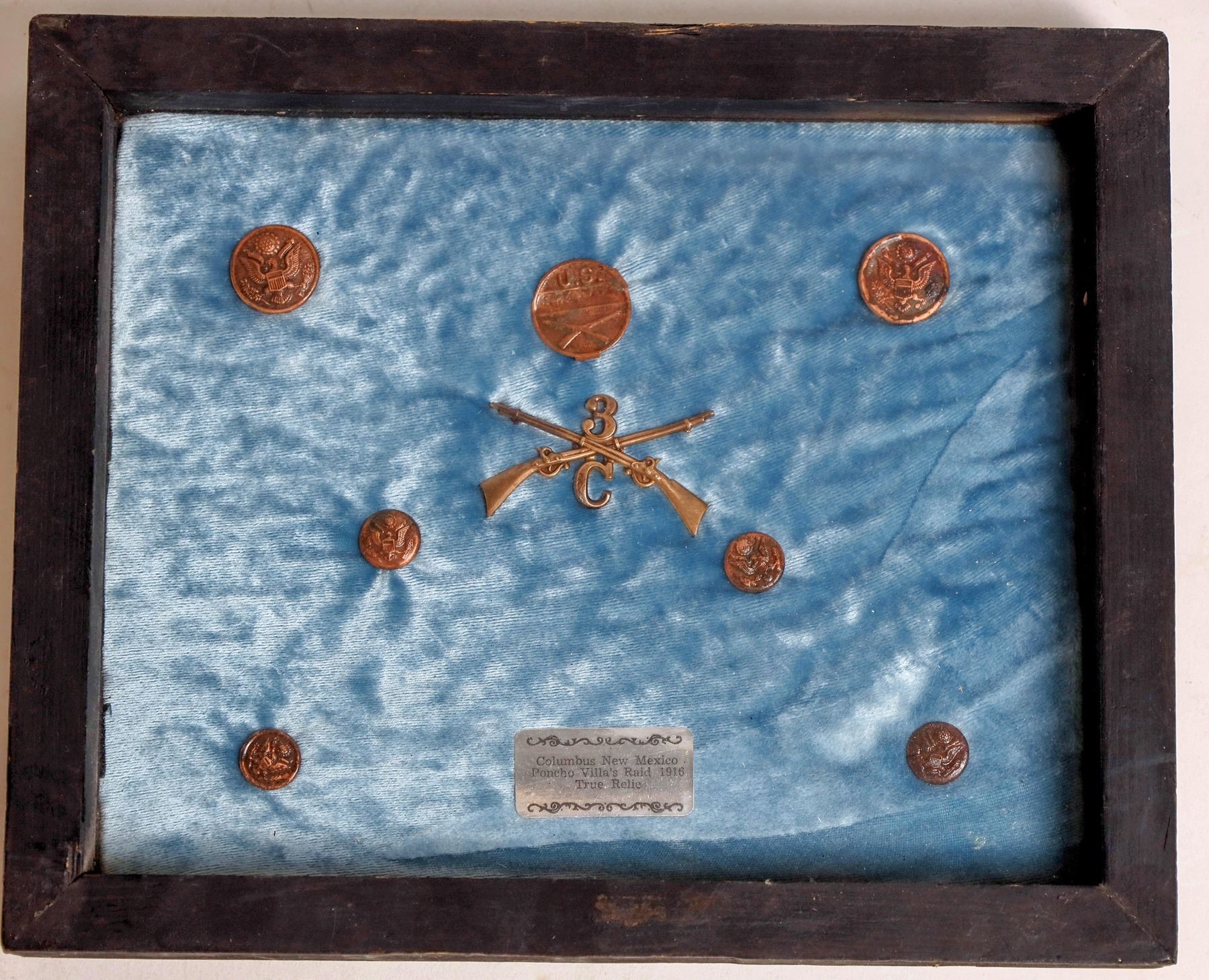 This shadow-box contains 6 uniform buttons, an early type of pin-back dog tag #S24106, and the crossed muskets cap emblem of the 3rd squadron of the 13 Regiment stationed at Columbus, New Mexico on March 9, 1916. The early morning raid by Poncho Villa resulted in an international incident where ten American citizens lost their lives and the 3rd squadron pursued Villa well into Mexican territory.