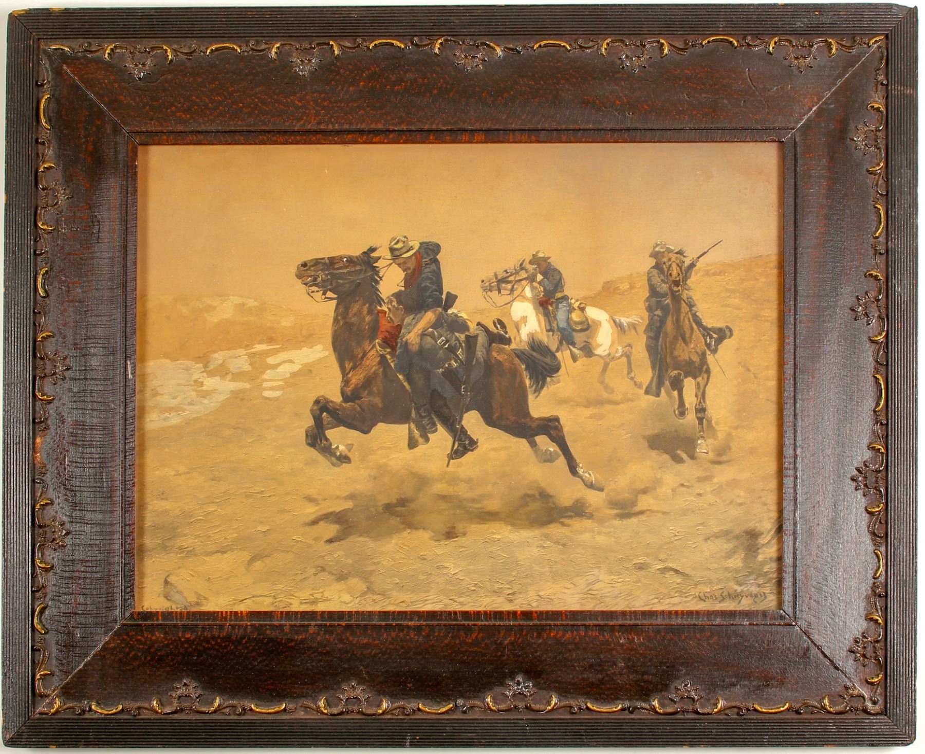 Beautiful artist-enhanced signed print by the artist in his studio. Lots of color & action in this print of an original painting enhanced by the artist in his studio. Contains the embossed artist's studio punchmark from 1901. Period wood framed. Signed,bottom right corner. Wood framed, has proof mark at left lower corner, Copyright/1900/By/Chs. Schreyvogel. Charles Schreyvogel (1861–1912) "My Bunkie" was finished 1899, Oil on canvas. Schreyvogel, like Remington, based his portrayals of cowboys and cavalrymen on a combination of firsthand experience & masculine escapist fantasy. Between 1893 & 1905 he made frequent visits to the western states and territories, collecting Indian & military artifacts for the authentically detailed paintings he produced in his Hoboken, New Jersey, studio. "My Bunkie" portrays an event described to Schreyvogel by a veteran frontier trooper he met in Colorado. In the heat of a violent conflict on the plains, a soldier heroically rescues a bunkmate who has lost his mount in a skirmish with unseen Indians. Two other cavalrymen continue their fire, protecting and covering for their fellow soldiers. When the painting was exhibited in New York in 1900, it elicited comparisons to Remington’s "Wounded Bunkie" 19.25" x 13.25" Framed: 27.25" x 21.5". State: City: Date: late 1800's HWAC# 83516