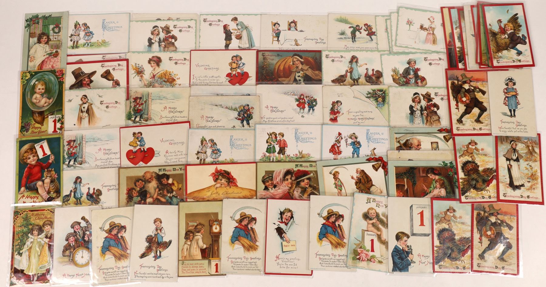Sixty-five litho postcards featuring prints of artwork done by Francis Brundage, from the U.S., c1910-1920. More than half are canceled, with stamps, some with the Panama-Pacific International Exposition cancel. Some are Tuck's postcards. Frances Isabelle Lockwood Brundage (1854–1937) was an American illustrator best known for her depictions of attractive and endearing children.