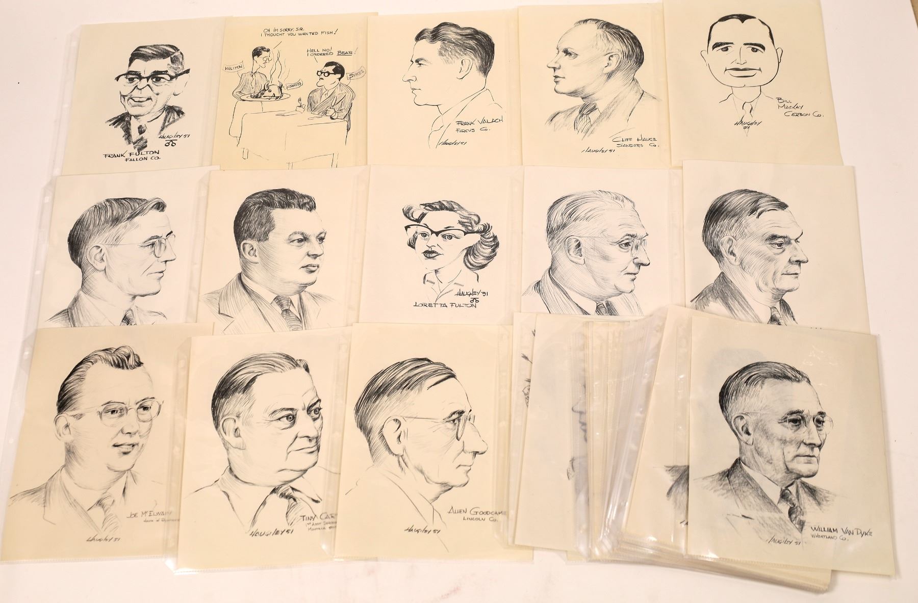 Lot of over 40 sketches of people, executives, politicians, musicians and cartoons done by an artist signs Haugiley '51.