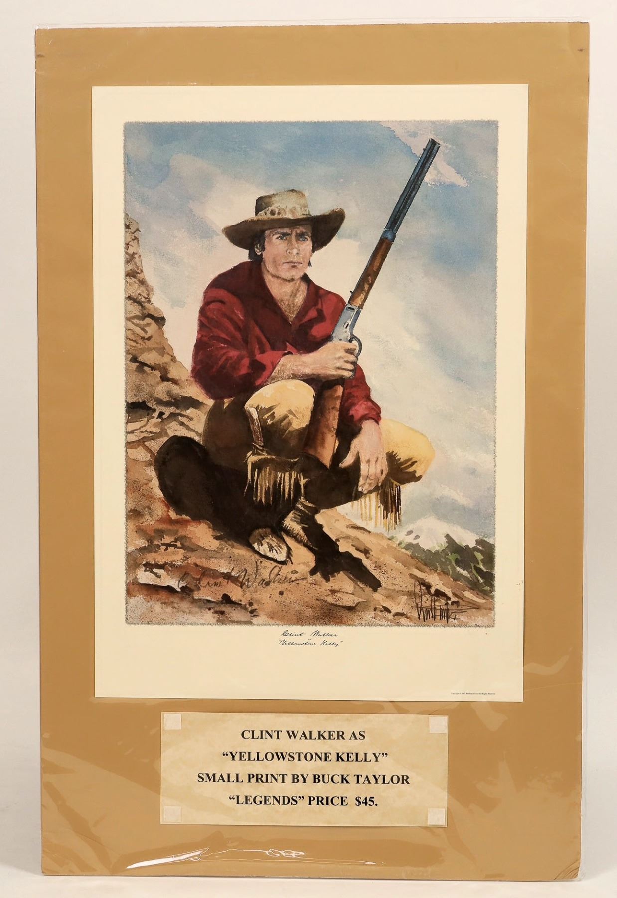 A print of actor Clint Walker as the title character in the 1959 big screen western, "Yellowstone Kelly." The original painting was done by actor and former "Gunsmoke" alum, Buck Taylor, who signed the 13"x 18" print. Besides being the son of character actor Dub Taylor (Bonnie & Clyde, among many others), Buck Taylor is famous for his paintings of many of his castmates, including those from "Gunsmoke." Picture is in great condition. Clint Walker has also signed the print. Please see photos for more details.
