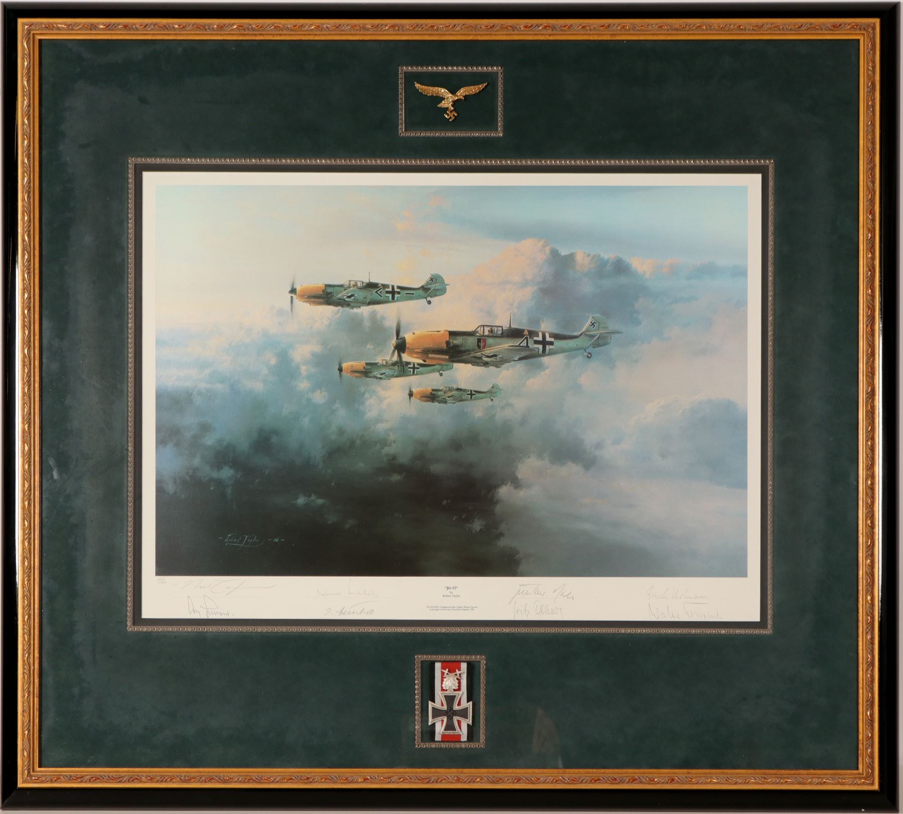 This print depicts four German ME-109s over the south of England in 1940. It is signed by seven Luftwaffe Aces; Genl. Walter Krupinsk. Genl. Dieter Hraback, Genl. Johannes "Macky" Stienhoff, Genl. Gunther Rall, Genl. Fritz Oblesser. Col. Erich Hartmann, and Genl. Adolf Galland. A limited print 656/1000 double matted at 36 in. X 39 in. on a beautiful teal green suede. Includes two German medals. City: State: Date:
