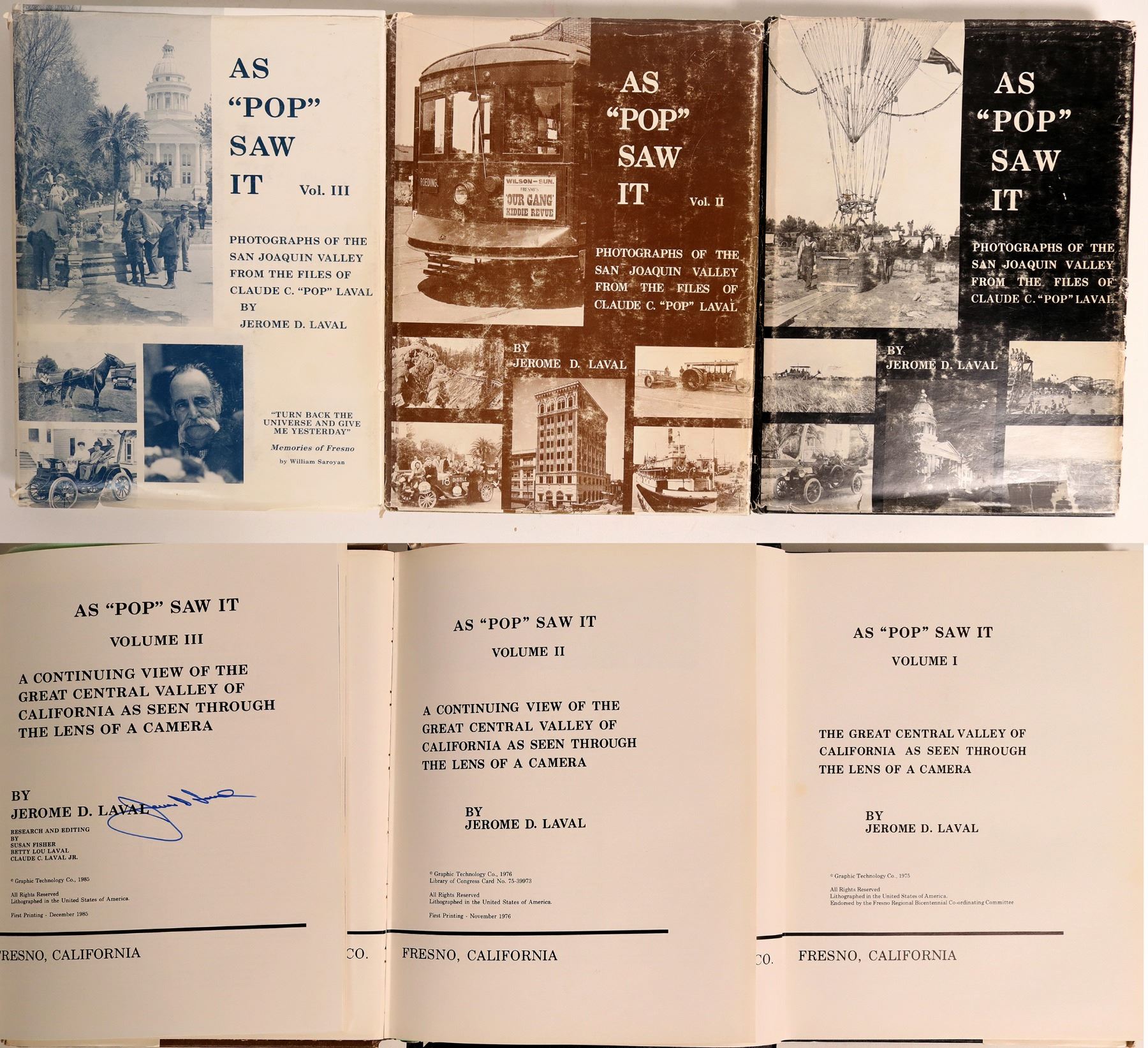 Lot of 3 volumes. "Photographs of the San Joaquin Valley From the Files of Claude C. "Pop" Laval. Written by Jerome D. Laval. Included: Volume I, 1975, hc w/DJ in rough shape; Volume II, 1976, hc w. DJ in rough shape; and Volume III, 1985, signed, hc w/ DJ.