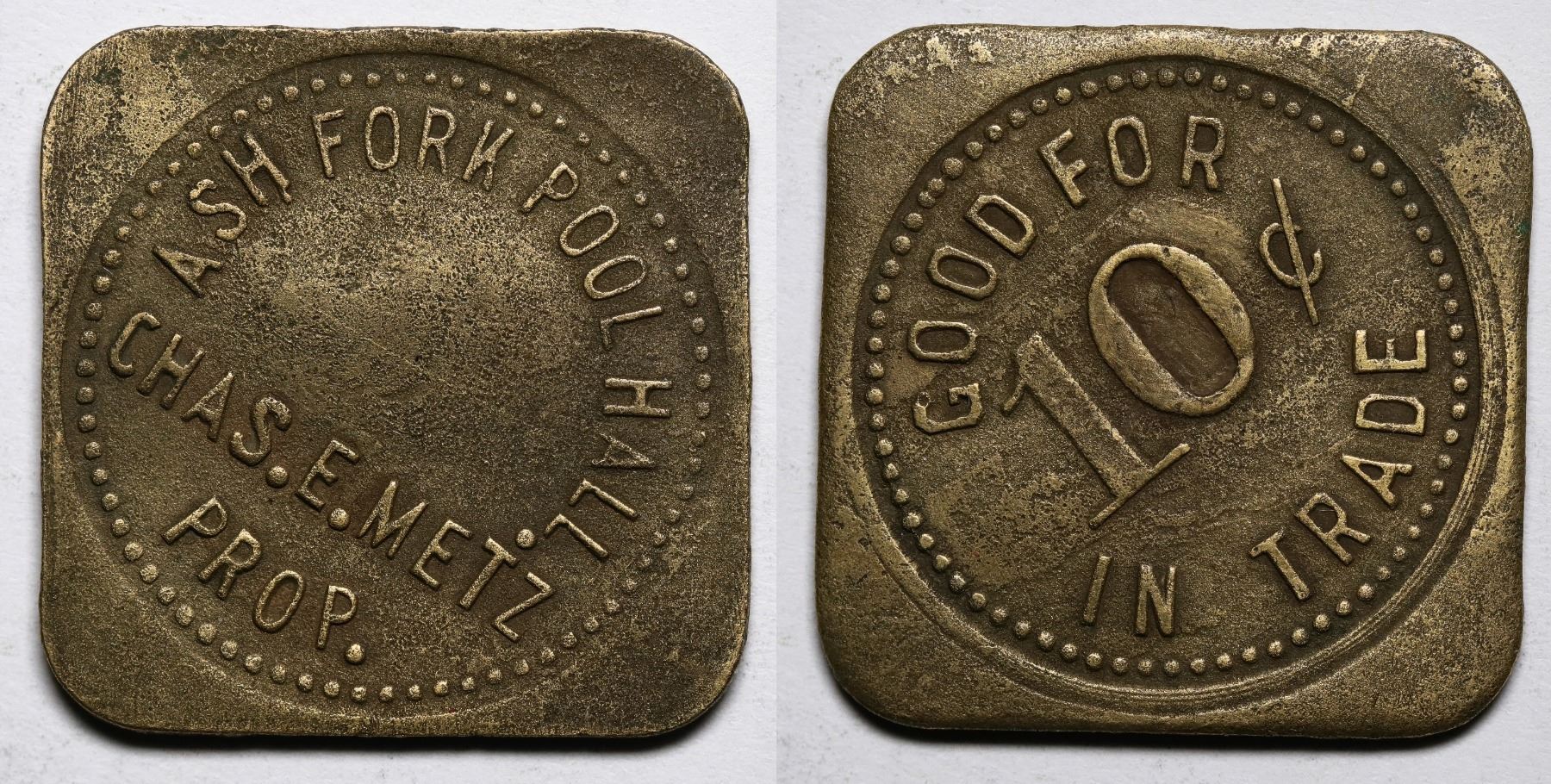 Ash Fork Pool Hall/ Chas. E. Metz/Prop.//G.F./10¢/ In Trade. Square, Br., 25mm. R-9, tough to find.