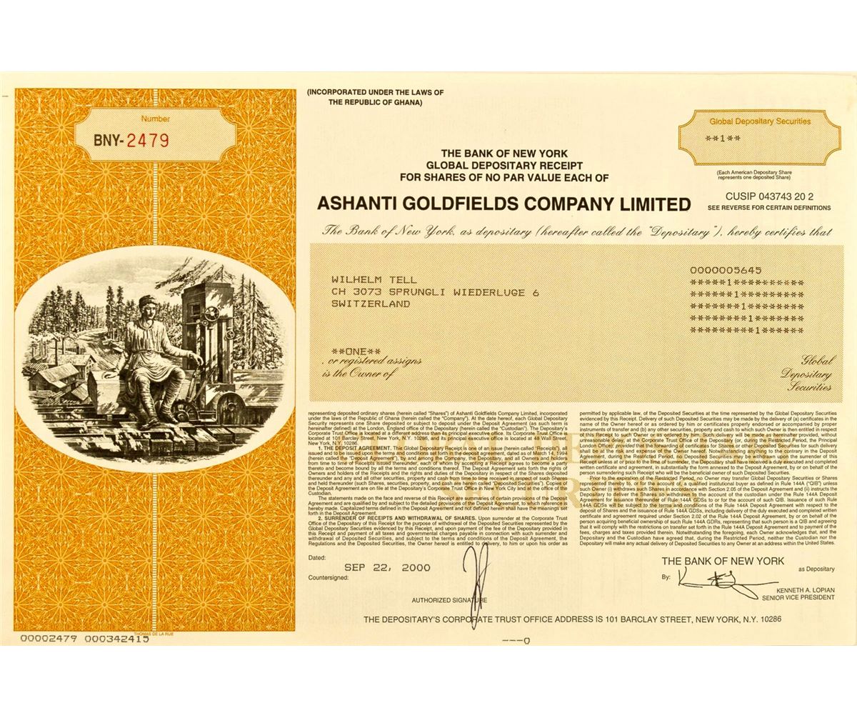 Incorporated in the Republic of Ghana. No. BNY-2479, issued to Wilhelm Tell of Switzerland for 1 share. Signed by Kenneth A. Lopian, Senior vice President. Large vignette at left of Ghanaian? man seated on a railcar pumper, with mill site among the pine trees in the background. White paper with orange underprint and safety print. ñThe Bank of New York Global Depositary Receipt For Shares of No Par Value Each ofƒî is printed above company name. U/C. Printer: Thomas de la Rue. Initially founded in 1897 by Edwin Cade. The property is one of the ten largest gold deposits in the world. The company is the first African company to be listed on the New York Stock Exchange (1996). It is now merged with AngloGold (2004). 8 x 12.î Date September 22, 2000 Obuasi, zGhana hwac 10183