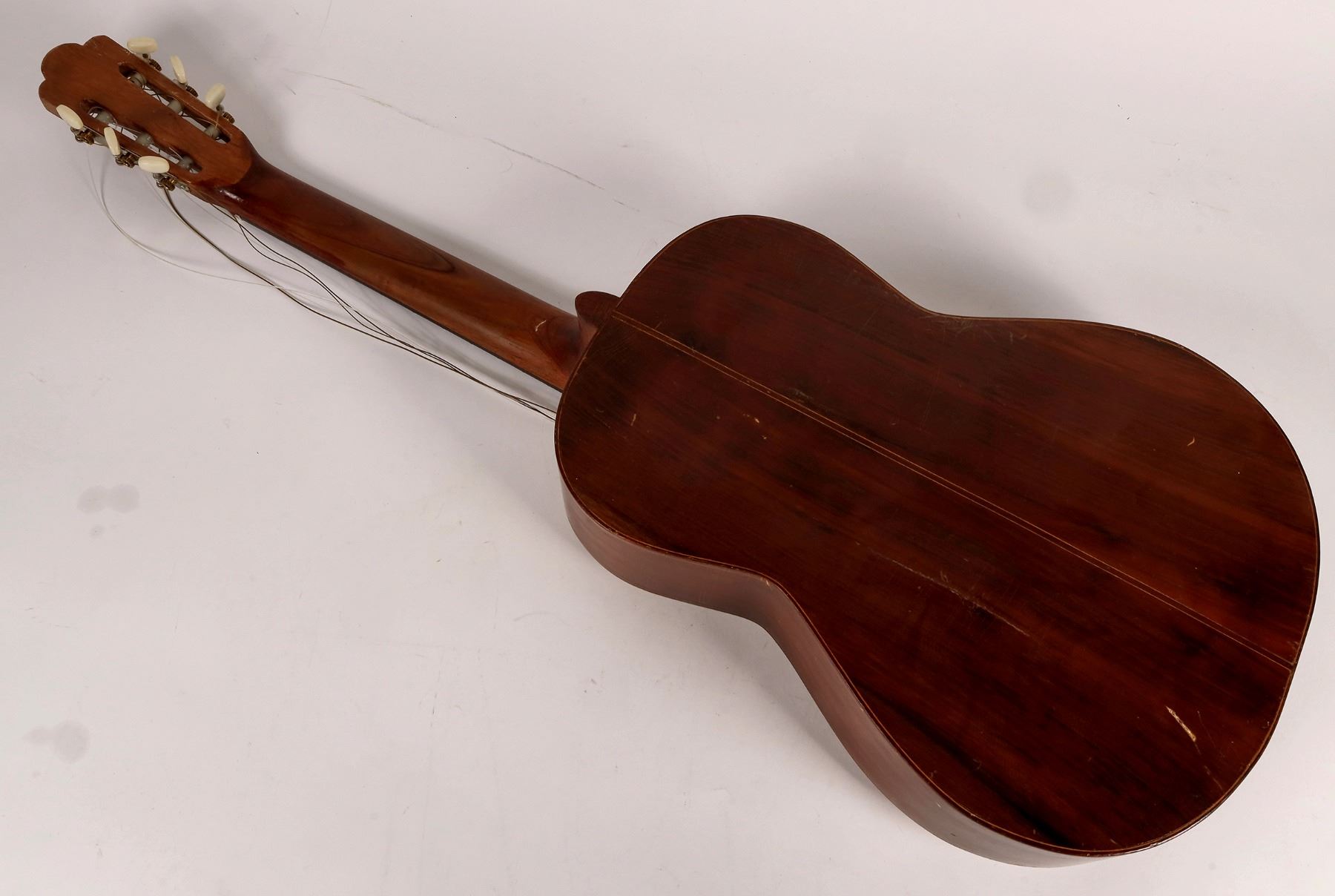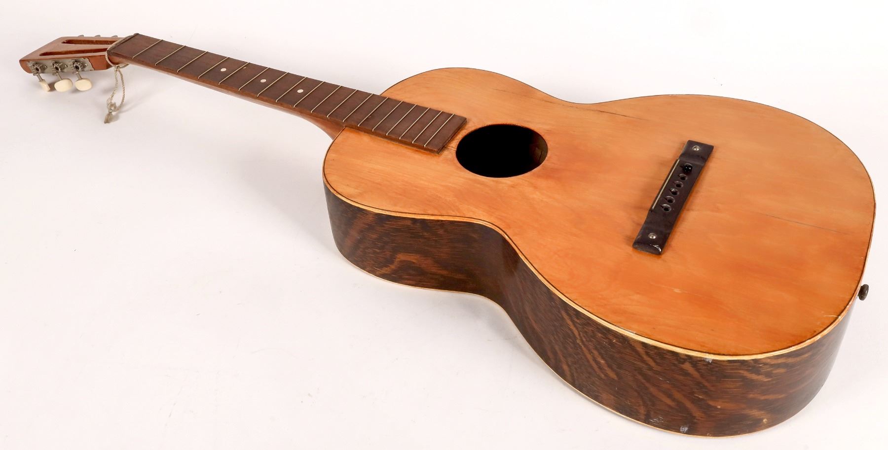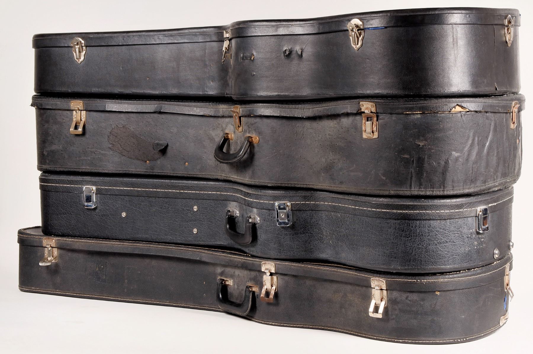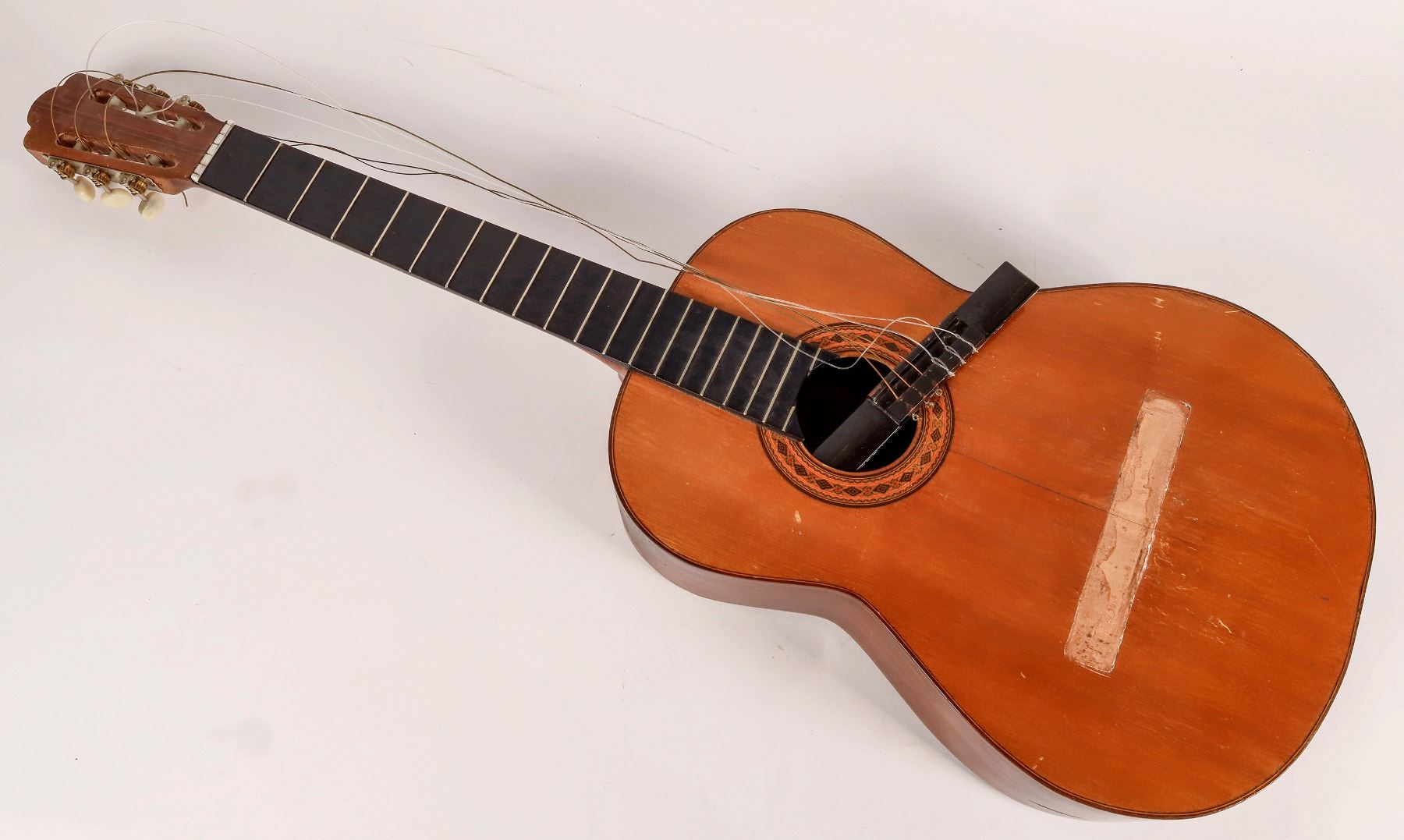 Ashville model AG506SB/C sunburst acoustic guitar, no s/n, made in China, a few side dings, hard case missing handle, 43x18", 14 lbs. Unmarked acoustic wall hanger, cracked and missing bridge pins, hardcase 43x18", 9lbs. Dauphin acoustic guitar, model 12, no sn, made in Japan, a few top dins, back scuff, hardcase 41x17", 9 lbs. Juan C Bustelo classic acoustic guitar, 1966, wall hanger, back crack, chips, detached bridge, hardcase 43x15",