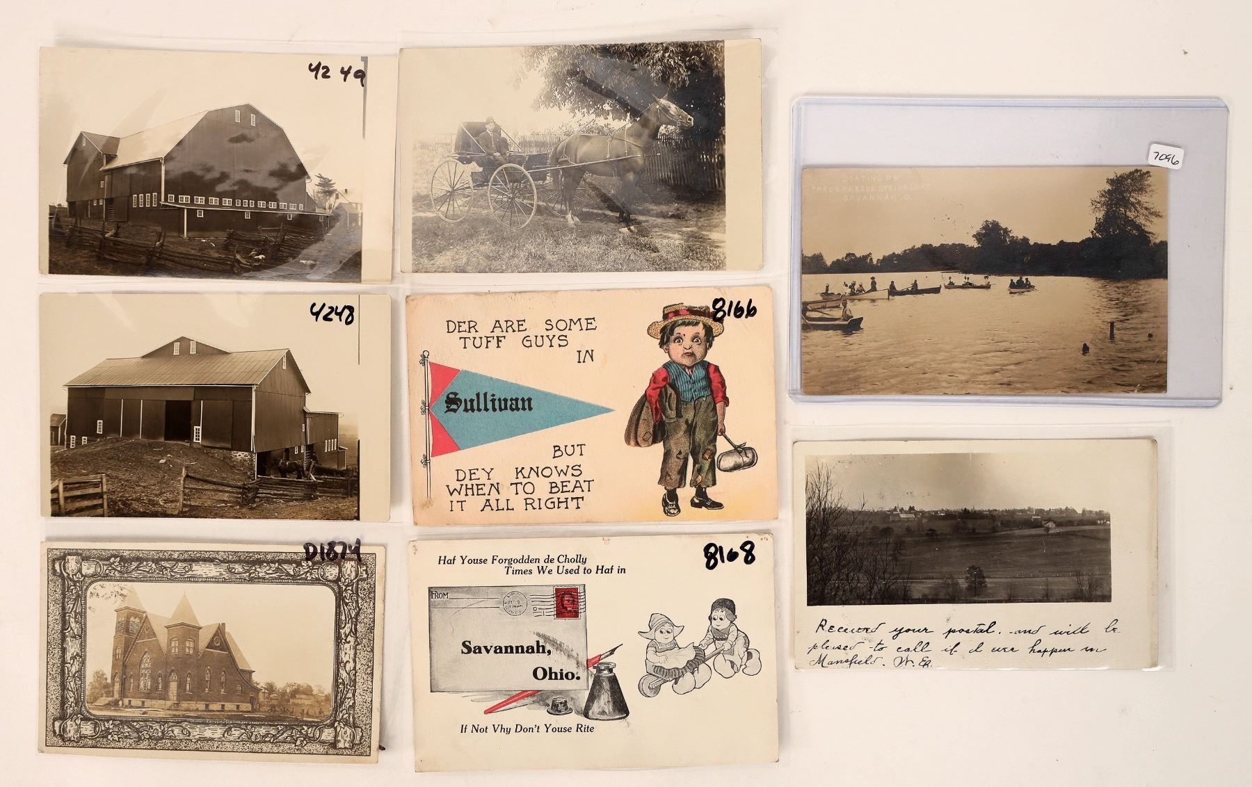 8 Ashland postcards with 4 RPC's-horse drawn carriage, 2 barns, boats on a lake. Church, pennant etc.[ Ashland County Ohio