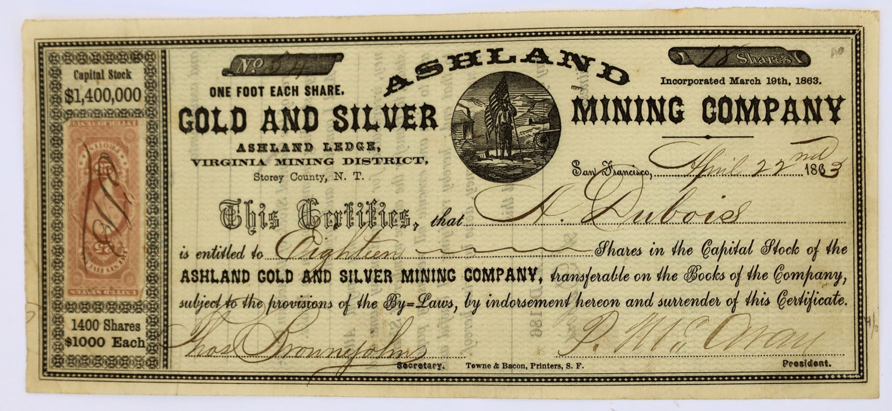 Ashland was a small mining community that connected Virginia and Gild Hill. Not in any Nevada history books. Information came ONLY from the Virginia Evening Bulletin of September 9, 1863. it was located between Virginia City and Gold Hill (entire article is included.) # 54 for 18 shares to A Dubois. Signed by Thomas Brownejohns and P Mc(?) president. Dateline San Francisco 1863. Incorporated March 10, 1863. 25c protest revenue stamp. Not cancelled. Miner holding flag vignette. Towne & Bacon printer. Location: Ashland Ledge, Virginia Mining District, Storey County, N. T. The California Daily Alta of October 7, 1862 has stock selling for the Ashland Gold and Silver Mining Company. According to the cert it wasn't incorporated yet? It is listed as adjoining the Ophir - an enviable location. (Notes included.)