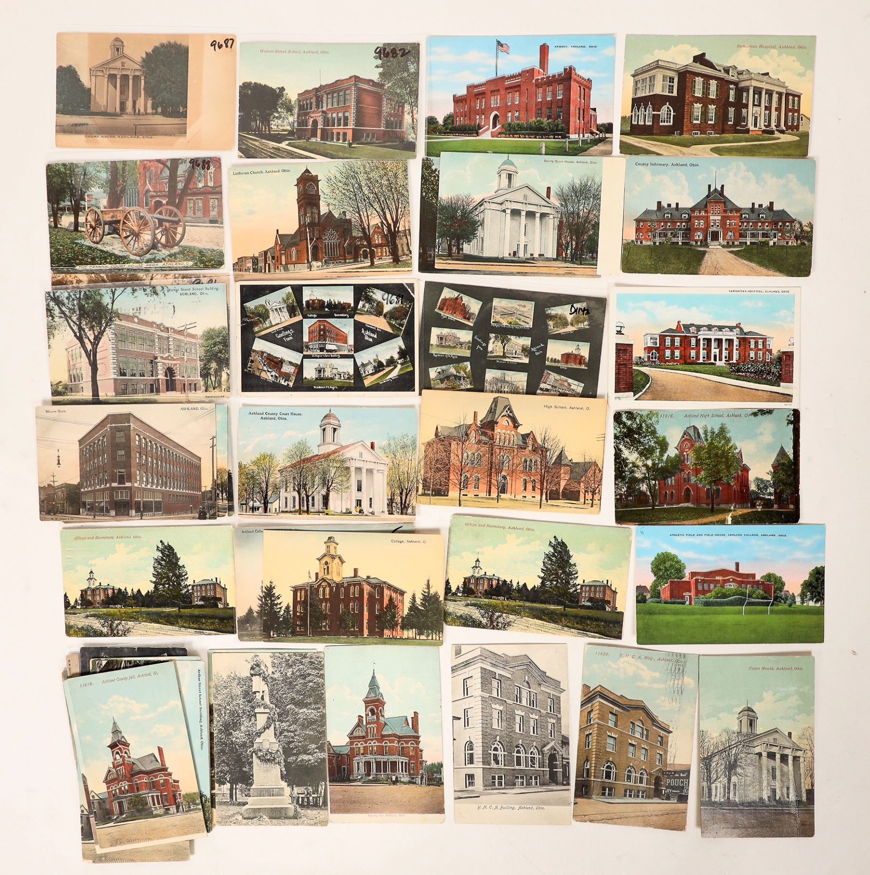 About 40 Ashland public building postcards. College & dorm, court house, county jail, soldiers monument, Walnut St. school, church, street scenes etc.[ Ashland Ohio