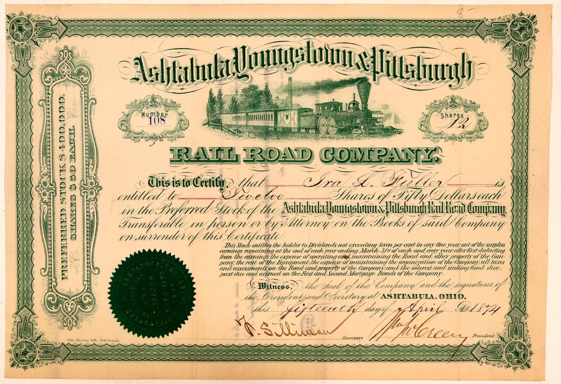 Cert. #108, issued in 1874 for 12 preferred shares to Ira L. Fuller. Signed by Green as president and J.S. Sullivan as secretary. Train of cars l-r. Green on creme with green seal. Odd shares. Shares were $50 each. $400,000 authorized. The company was incorporated in 1870. Uncancelled.