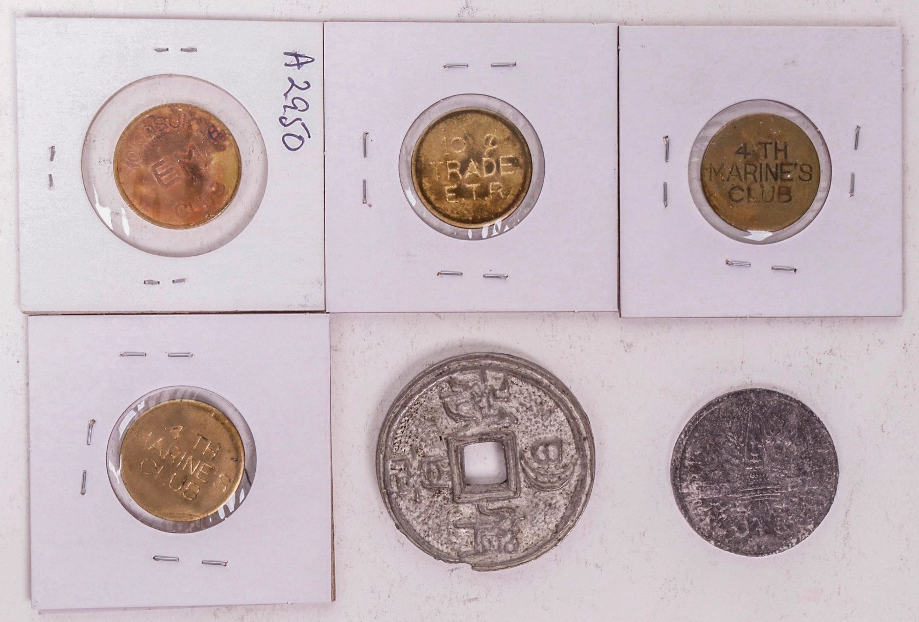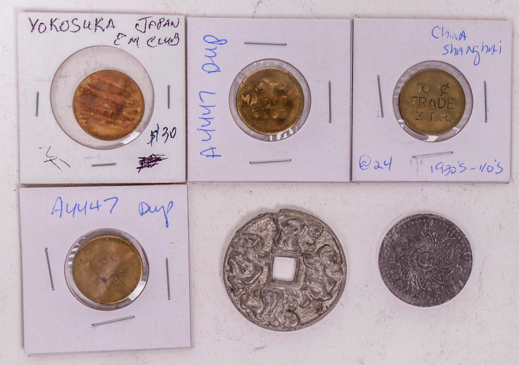 Six coins: 1862 Thailand 1/8 Fuang; Yokosuka EM Club, Japan; 4th Marine Club (3) Shanghai.