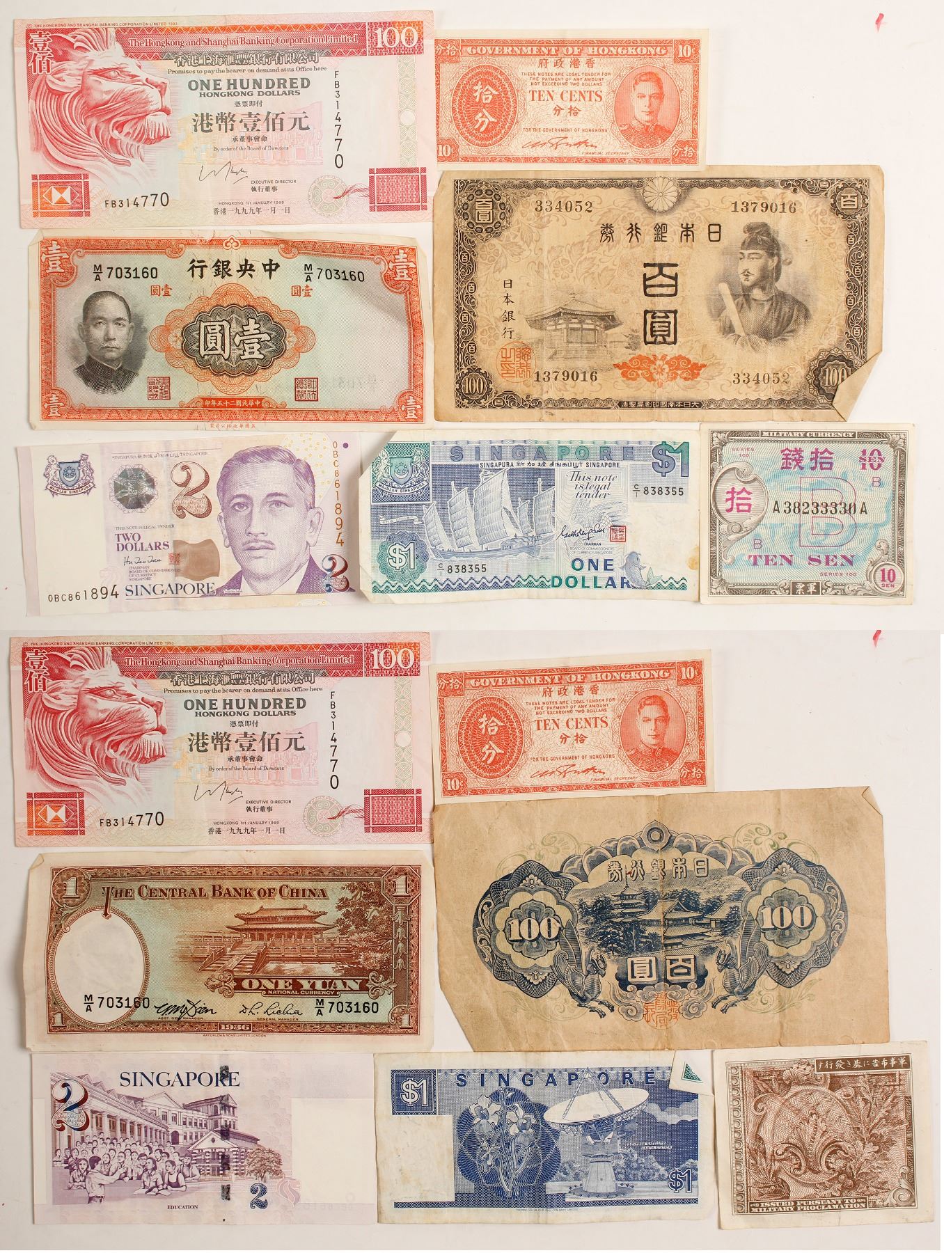 Seven pieces of Asian currency including 10 cent Hong Kong, $1 & $2 Singapore, $100 Hong Kong, 1999, two pieces are all Asian markings.