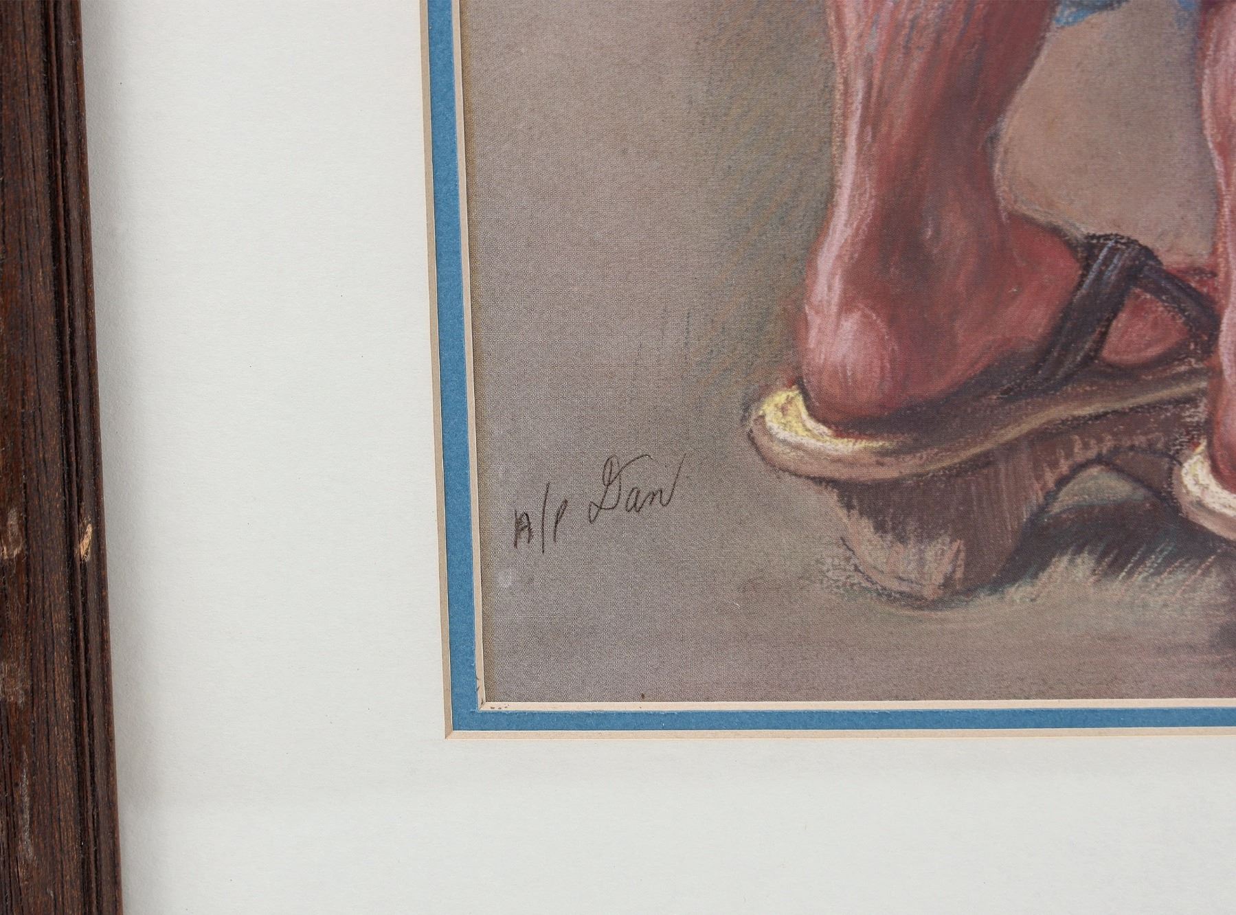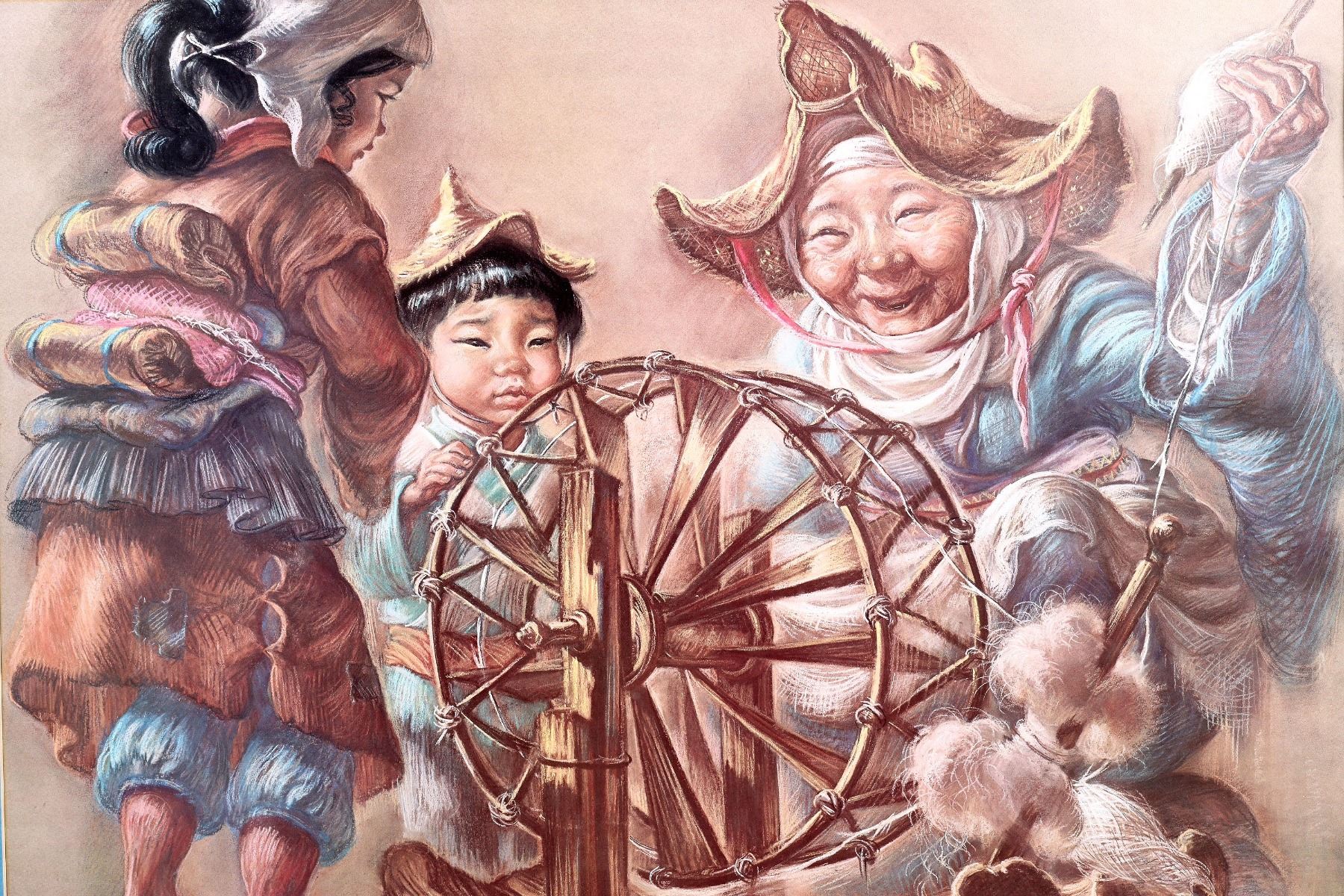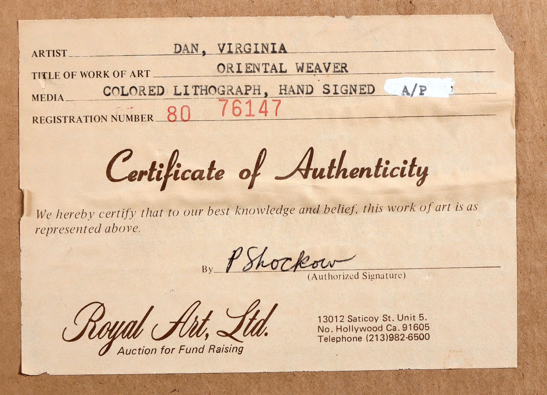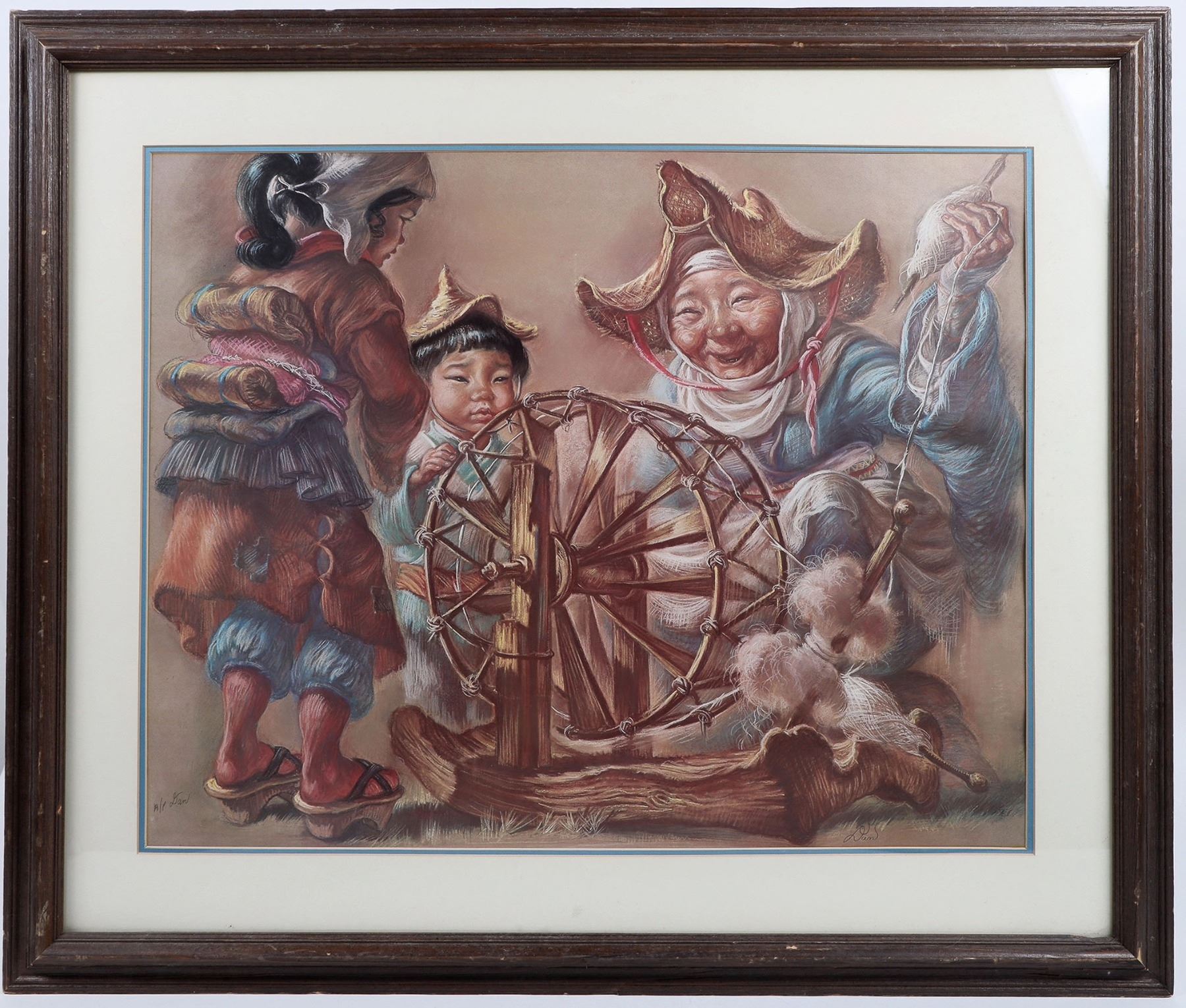 Framed and matted print (30" x 36") from an original A/P lithograph by Virginia Dan. Image of Asian children and mother or grandmother. This is an offset print, not the original A/P. Good condition. With CoA.