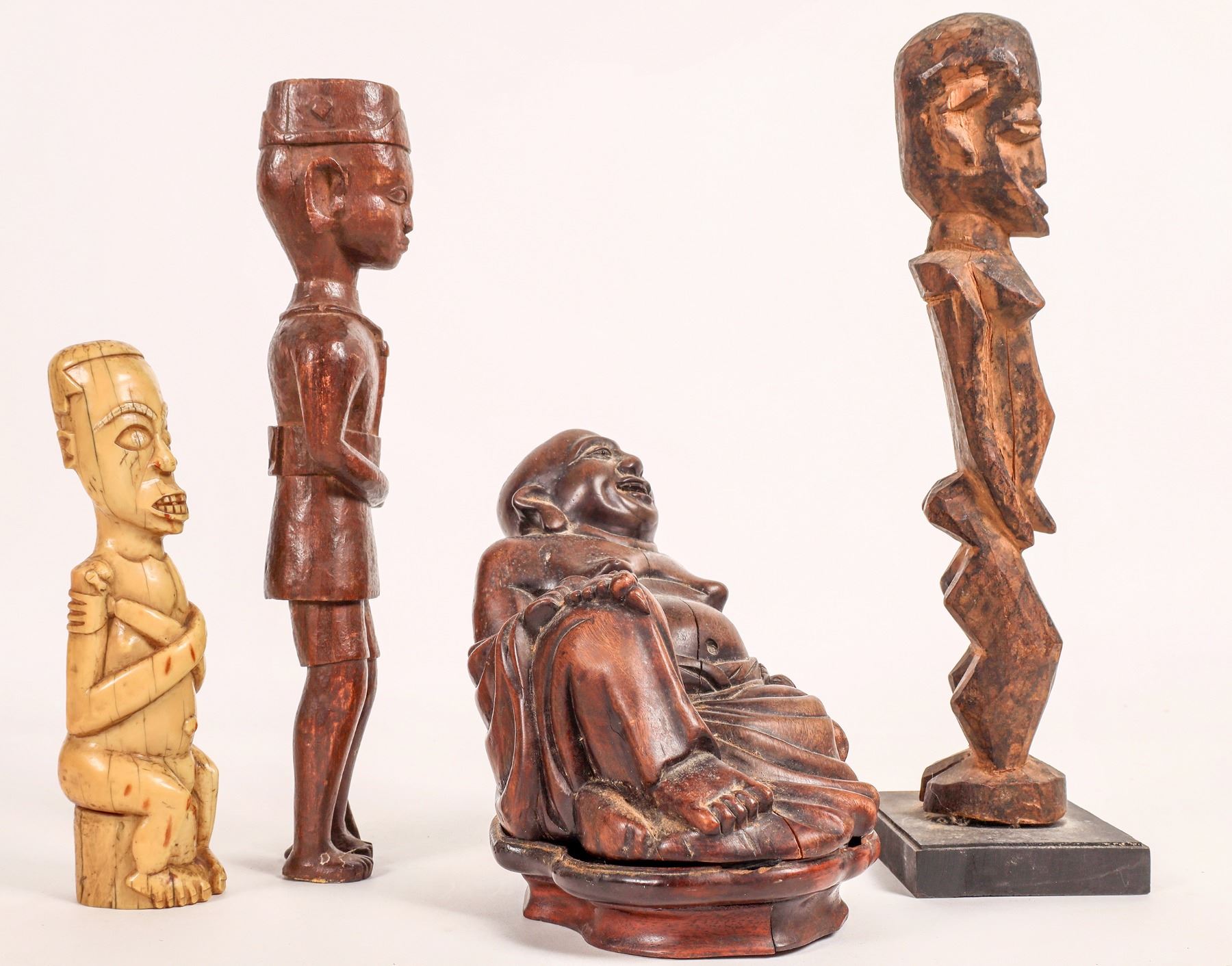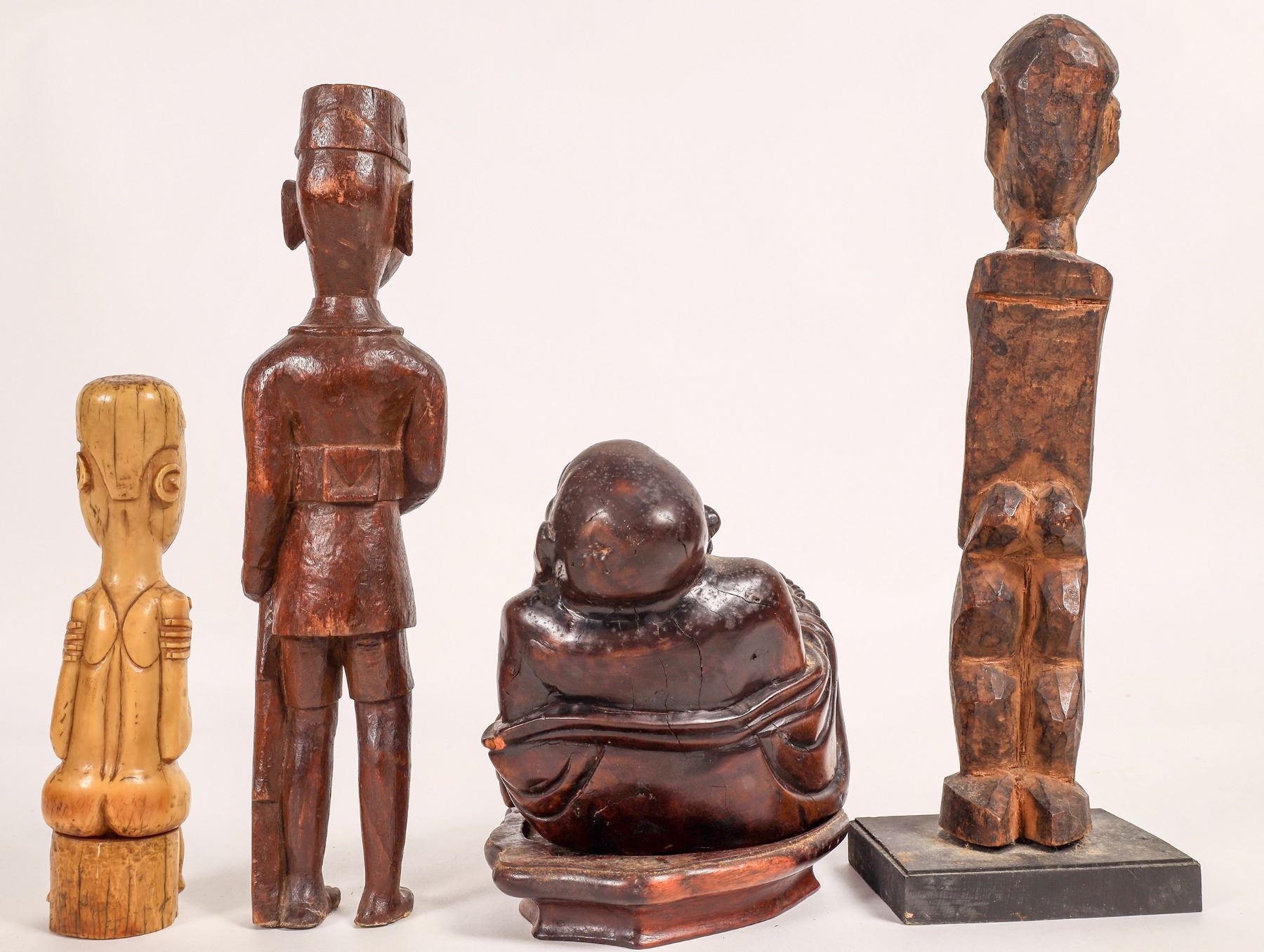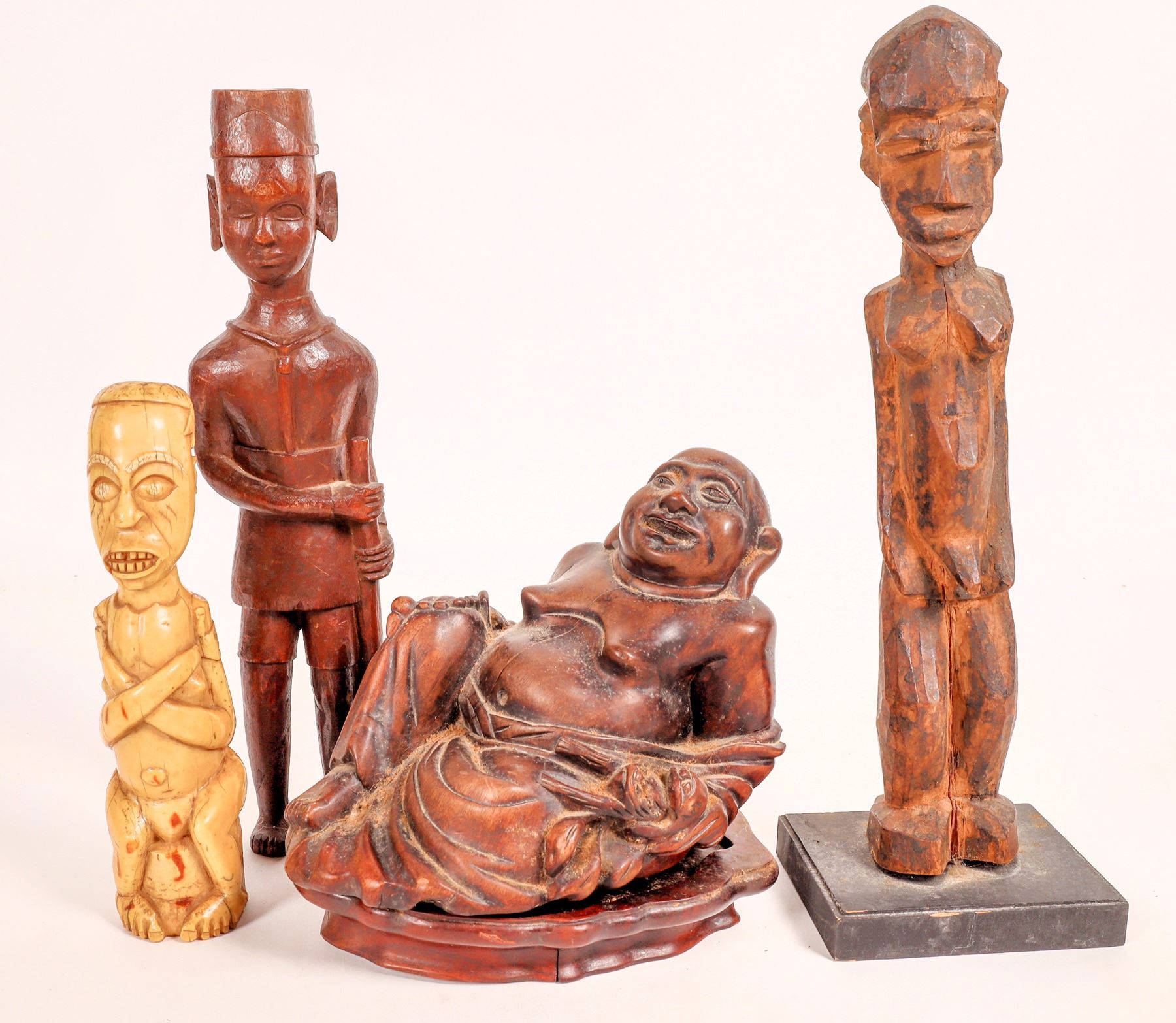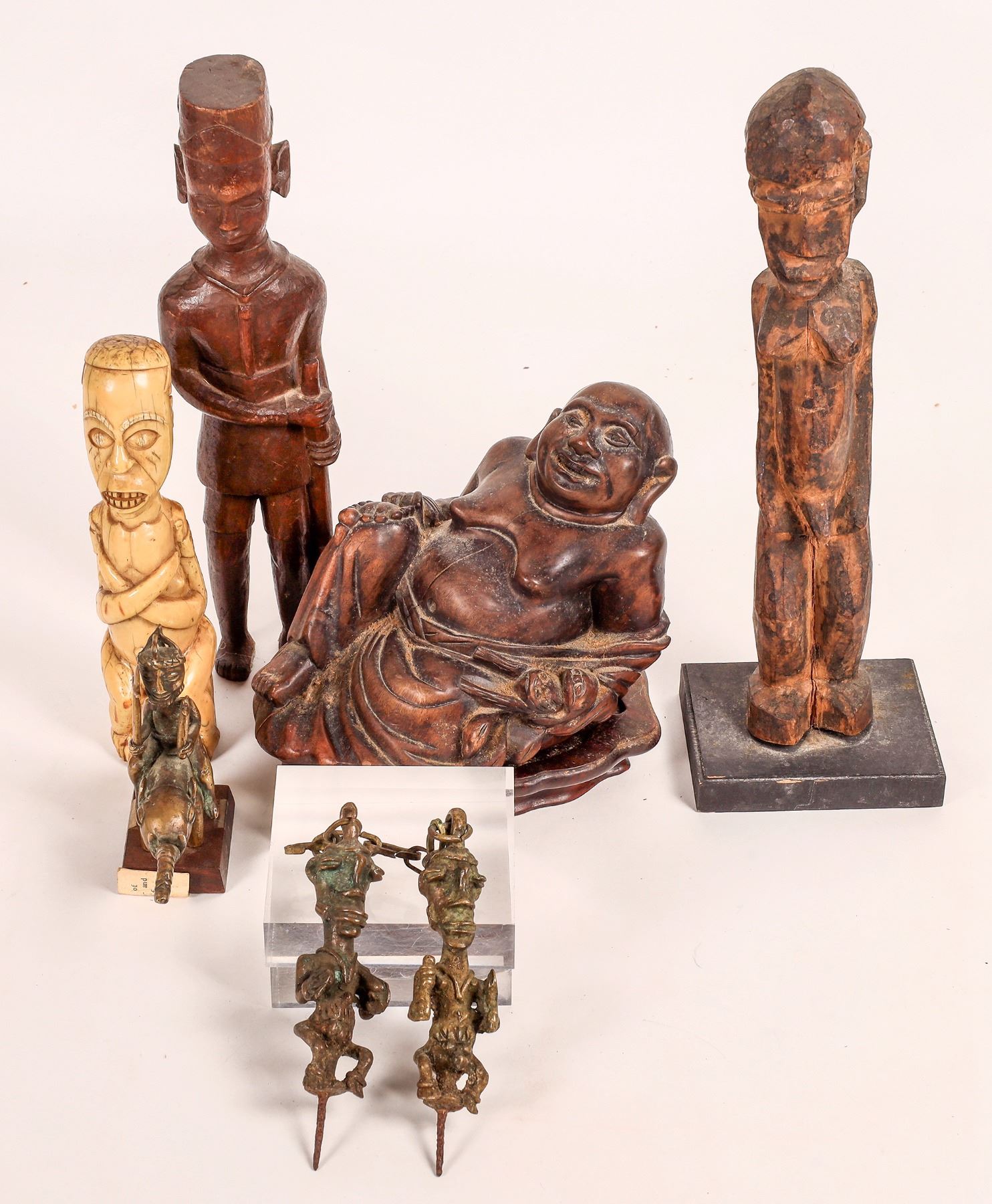 Carved happy man collection. Old bone 8", brown wood with rifle 12", seated brown wood 8" with base crack, brown wood on small base 13", cast metal pair with chain 5.5" tall, on elephant from Ivory Coast 4.75" tall.[ China