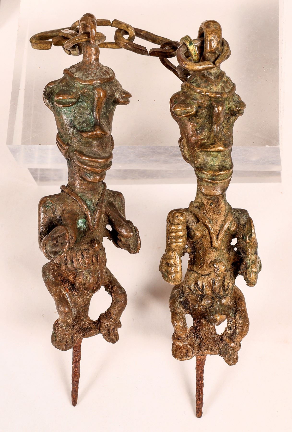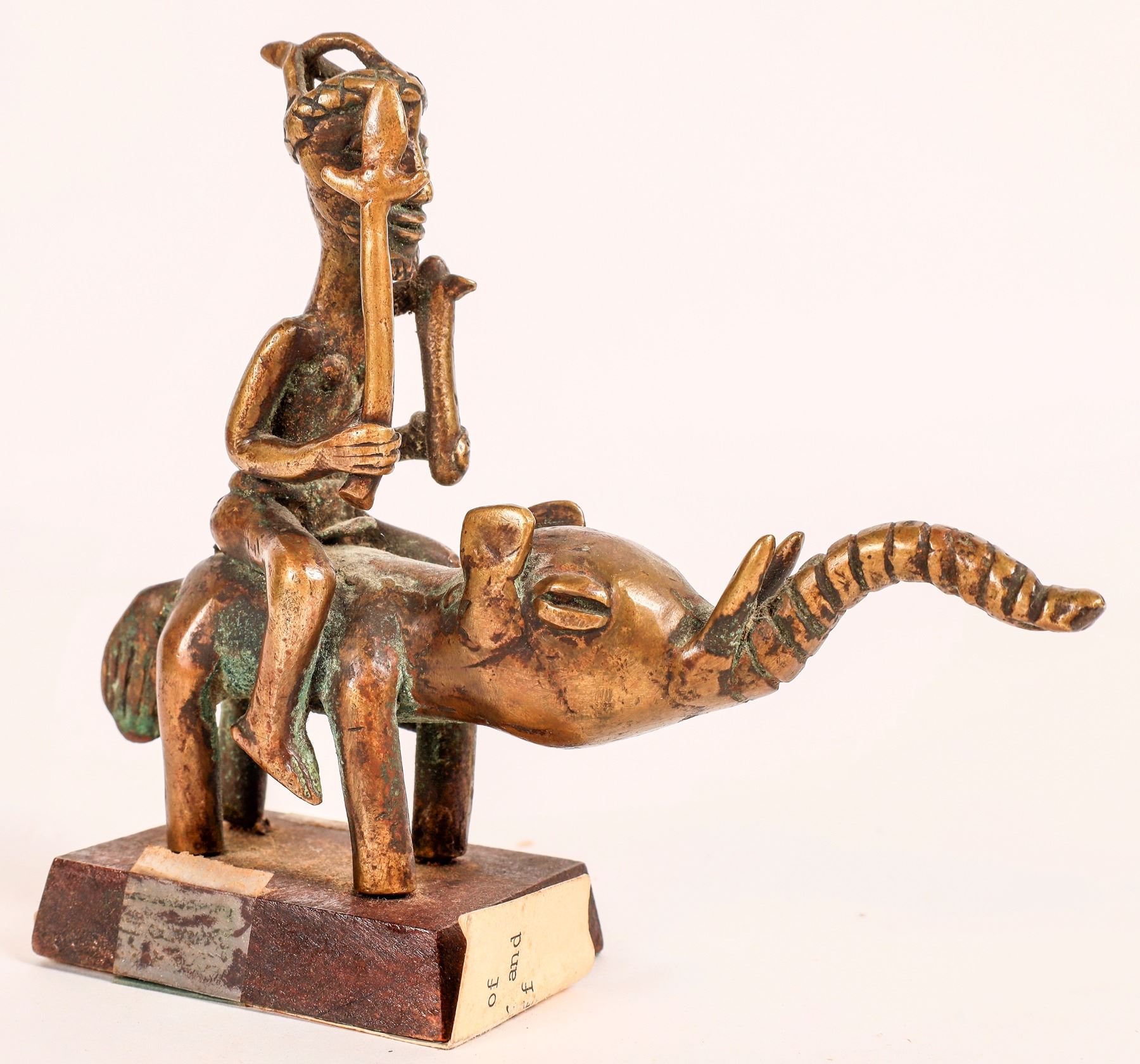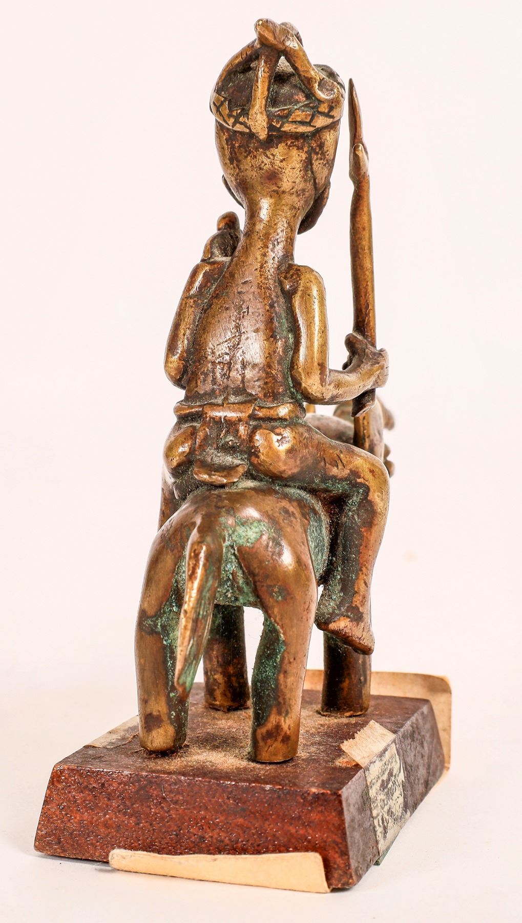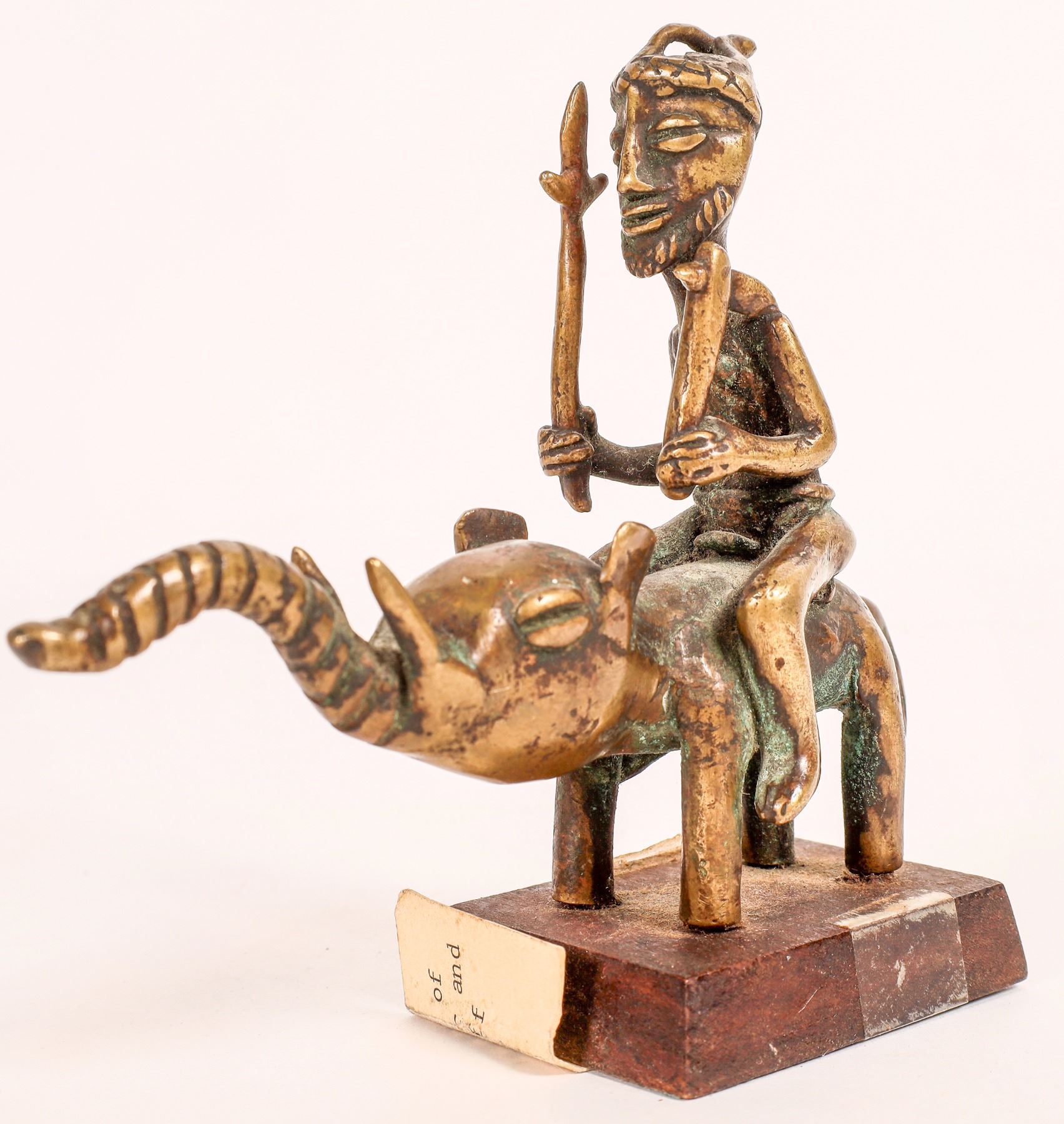 Carved happy man collection. Old bone 8", brown wood with rifle 12", seated brown wood 8" with base crack, brown wood on small base 13", cast metal pair with chain 5.5" tall, on elephant from Ivory Coast 4.75" tall.[ China