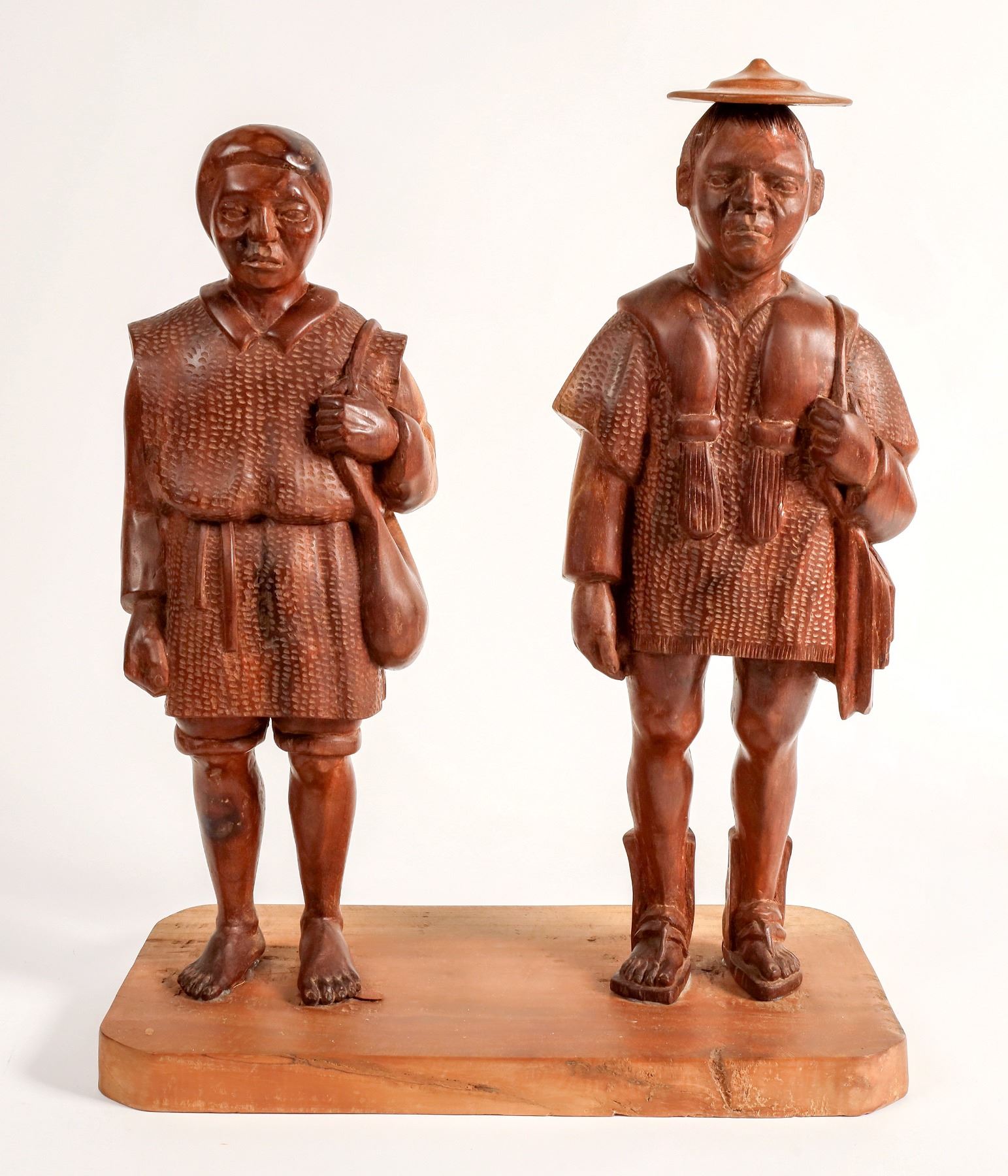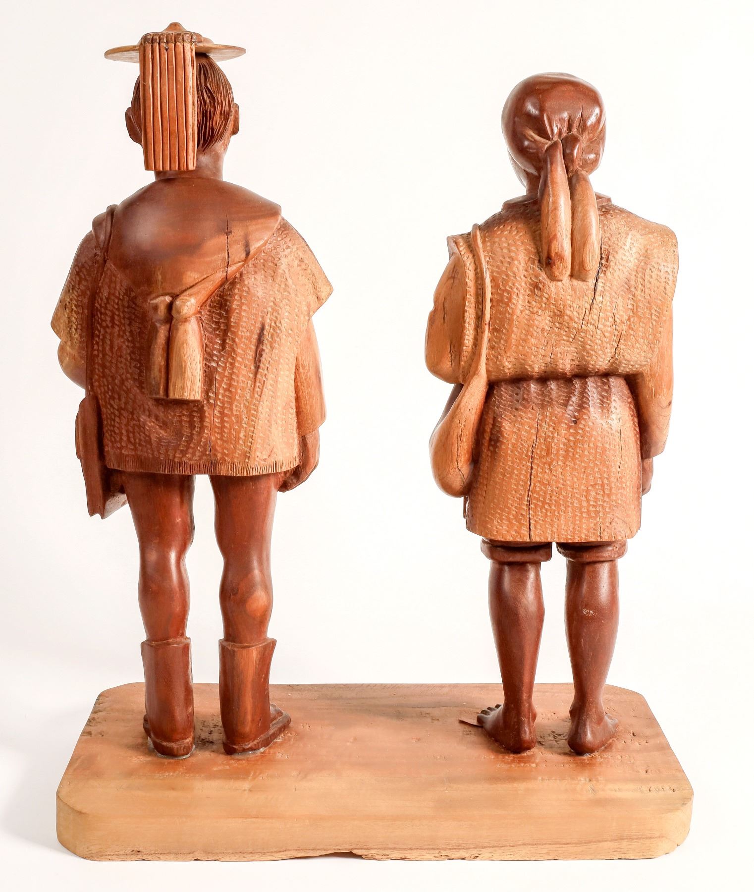 Hand carved wood Asian, possibly Mongolian?, man and woman adhered to wood base. People 16x6". Base 7.75x14.5x1.25". Unsigned. Light cracks on backs of figures.