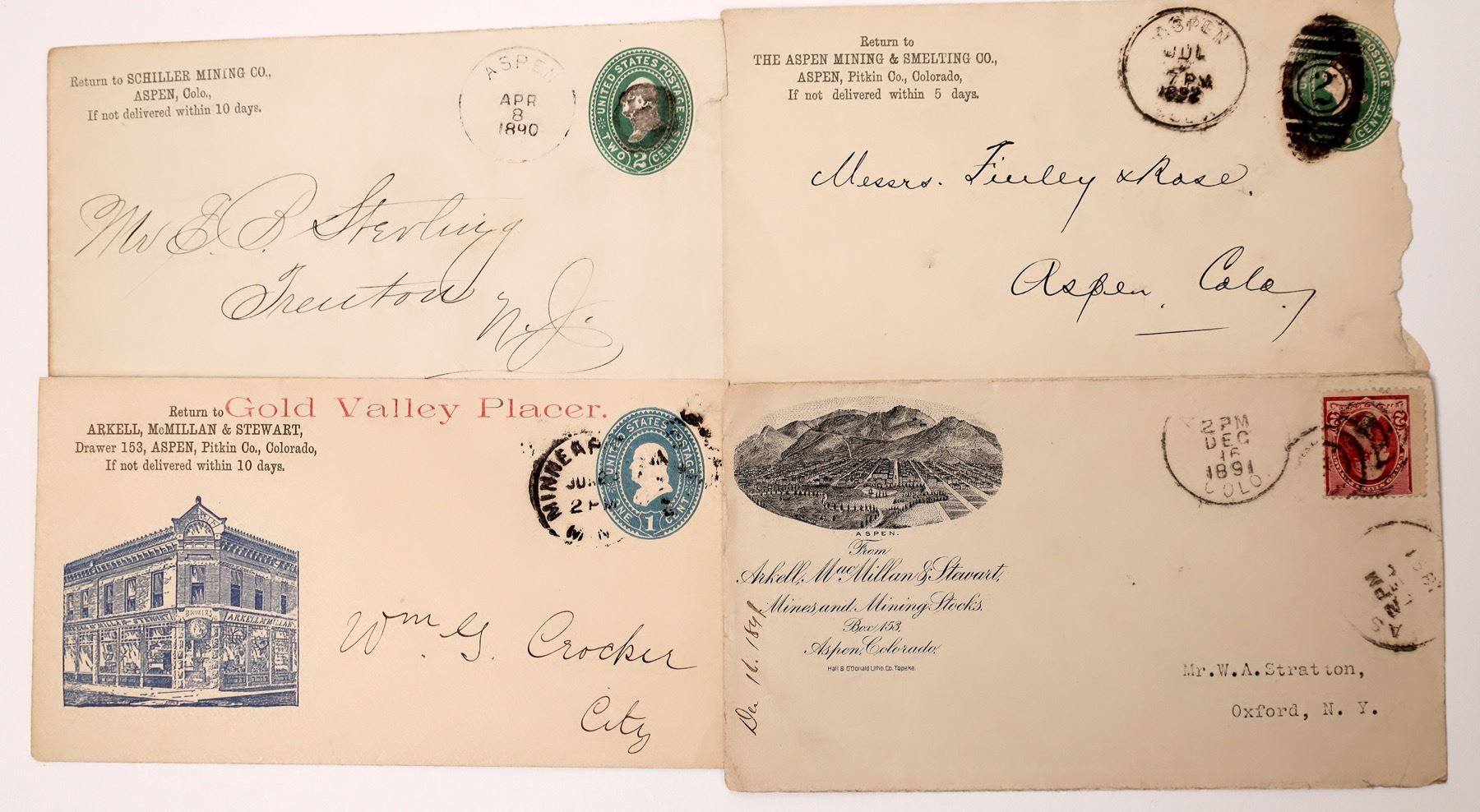 1) Arkell, McMillan & Stewart, Mines and Mining stocks. Very nice bird's eye view of Aspen Pictorial. Issued to W. A. Stratton. Stratton had the Portland Mine at Cripple Creek. He is considered the father of Cripple Creek. 2) Same Company, but pictorial is of their building. Pictorial and one cent stamp are in blue. Location is Aspen, Pitkin Co. Colorado. 3) Aspen Mining and Smelting company. 4) 1890 postmark. Cork killer from the Schiller Mining Company.