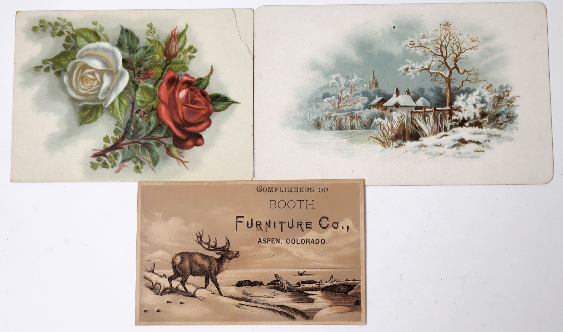 Lot of three extremely rare trade cards from businesses in Aspen, Colorado. Two are from C.F. Youberg, Dealers in Fine Shoes and Slippers and the other is from Booth Furniture Co. Different sizes, largest is 6 x 3.75. All good condition, in protective sleeves.