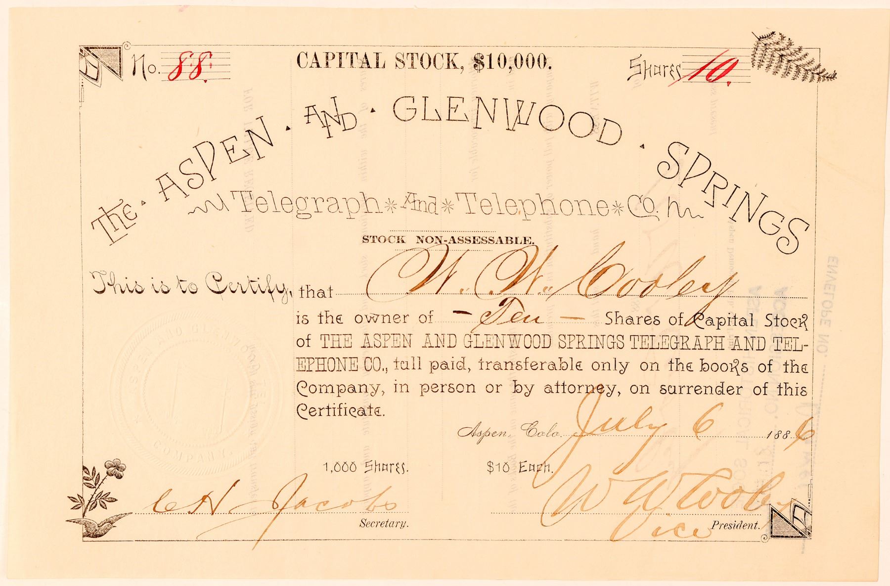Rare uncancelled. Dateline Aspen, Colo., July 6, 1886. No. 88, issued for 10 shares to the company vice president, W.W. Cooley. Also signed by secretary Jacobs. Small floral vignettes in the corners. No printer. 5.5 x 8.5" Folds, very clean. Colorado was a leader in the fledgling telegraph industry, and this company served the Roaring Fork valley between Aspen and Glenwood Springs. () Ken Prag Collection