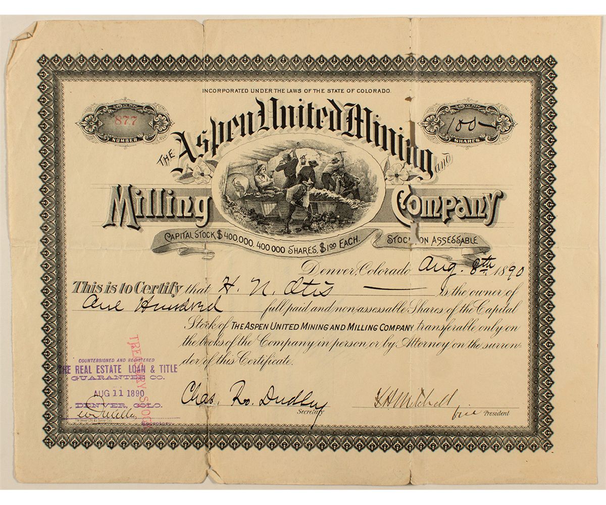 1890. Number 877 for 100 shares to H. N. Otis (signed on back) by secretary Charles Dudley and vice president FH Mitchell. Dudley arrived in Denver in 1882 and organized the public library in 1885. He would also become a member of the Board of Regents for the University of Colorado and the secretary of the Colorado Historical Society. The only reference we could find was the December 1890 “Engineering and Mining Journal” about a meeting in Denver. (It is right above a meeting announcement for the Gould & Curry of Virginia City, Nevada in San Francisco.)City: AspenCounty: PitkinState: CODate: