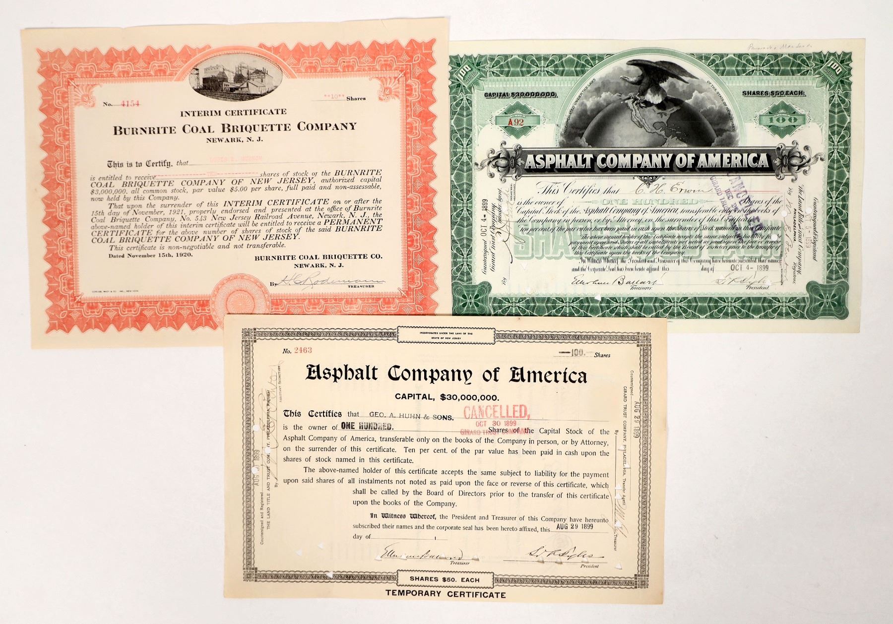 Issued-2 different 1899 Asphalt Company of America, 1920 Burnrite Coal Briquette-1.5" upper right tear.